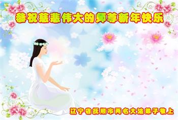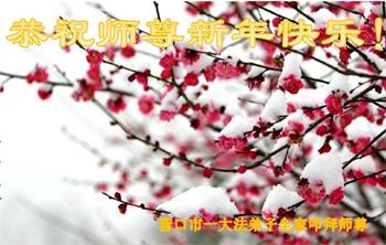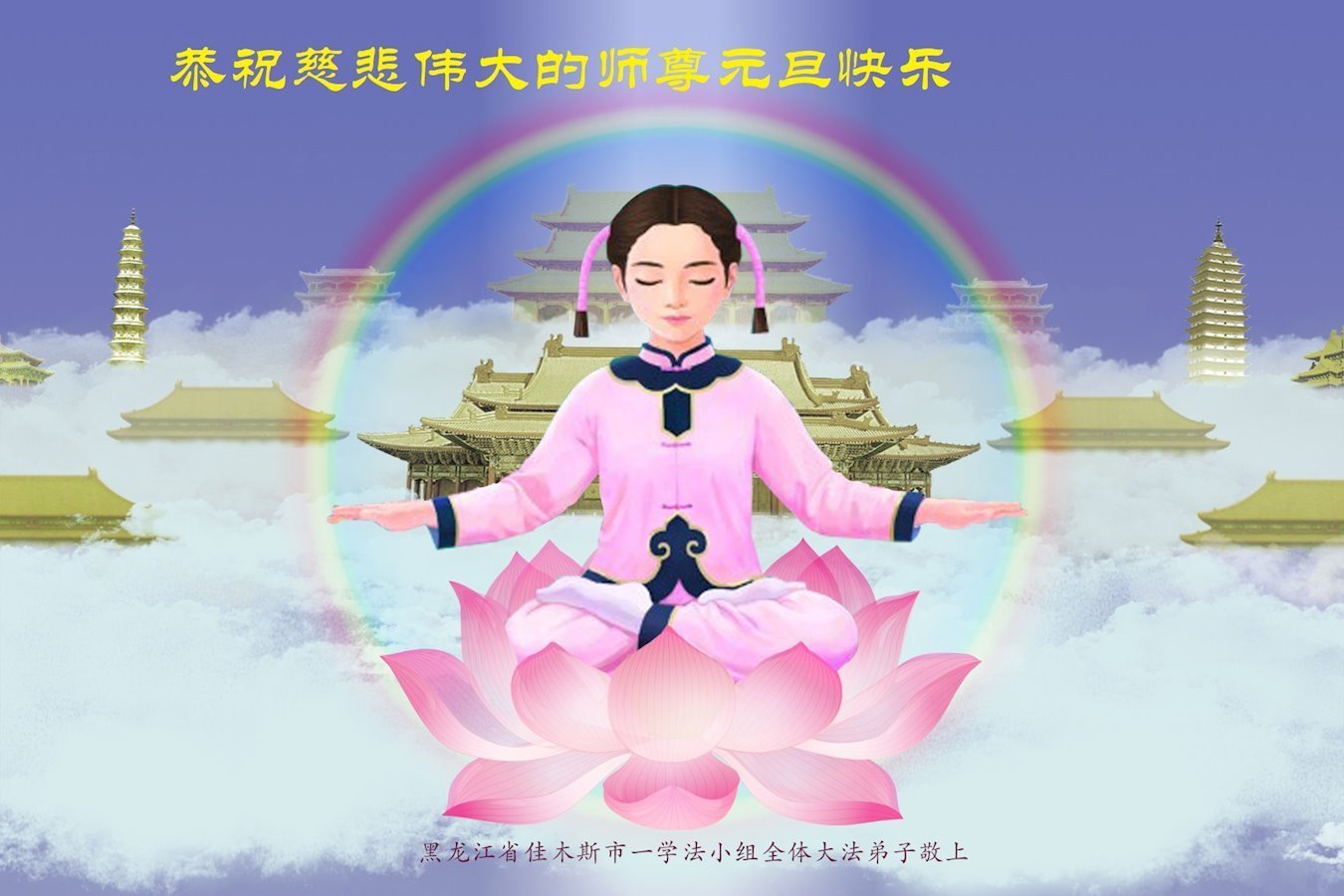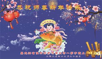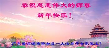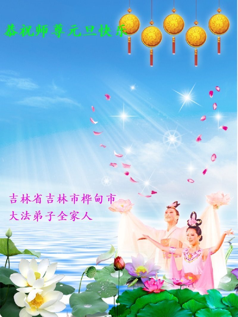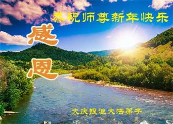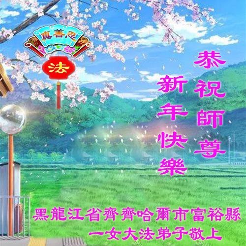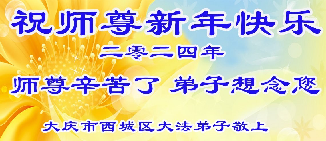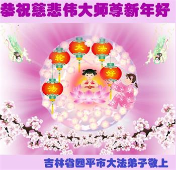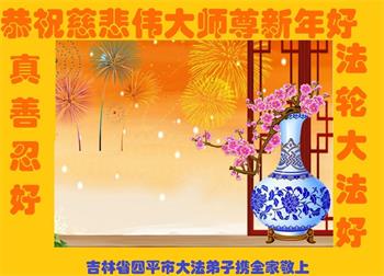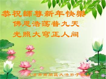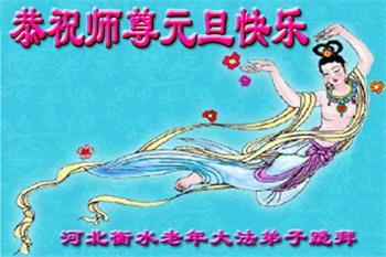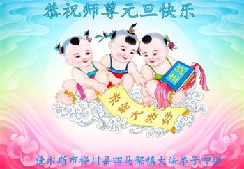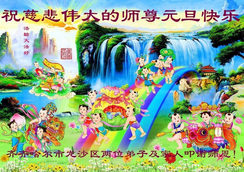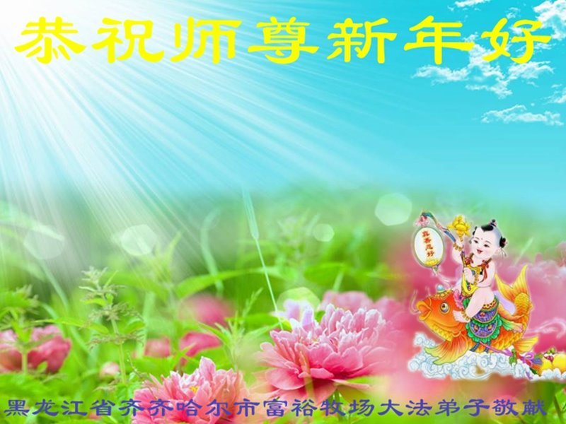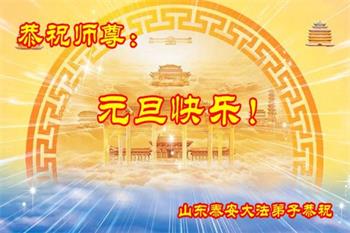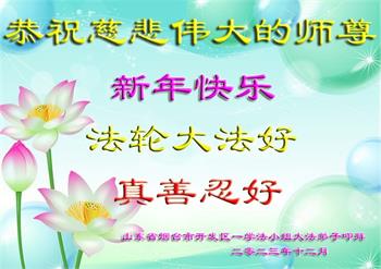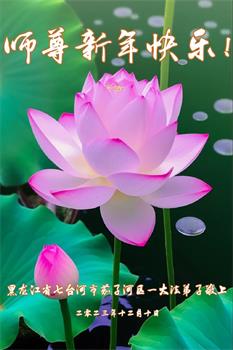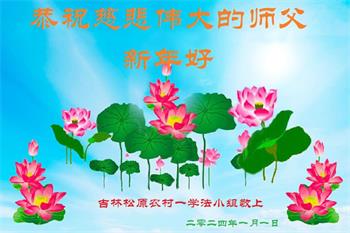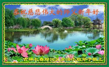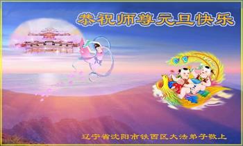 黑龙江省公安系统大法弟子在贺词中表示:“二十五年修炼的风风雨雨,弟子们都坚持下来了。请师父放心,在新的一年,弟子们一定会做的更好,勇猛精進,助师正法。”