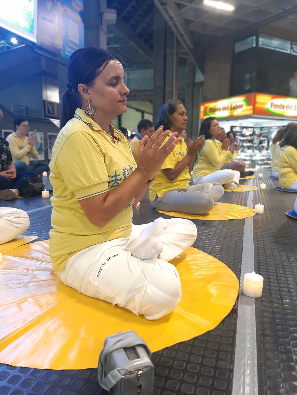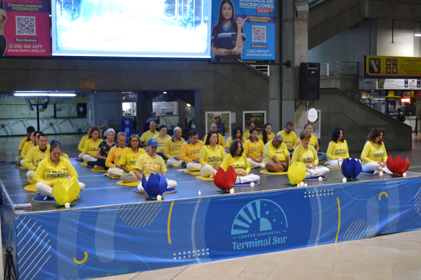 当天下午,学员们在波夫拉多地铁站集体炼功,这里是麦德林人流量最大的地铁站之一。他们告诉路人法轮大法的美好和一九九九年以来中共迫害法轮功学员的事实。晚上,学员在南航站楼购物中心(Terminal del Sur shopping center)举行烛光守夜活动,以和平的方式抗议在中国发生的迫害。活动中,许多路人停下脚步来了解有关法轮功的信息,他们在了解了法轮功学员遭受迫害的情况后都感到震惊。