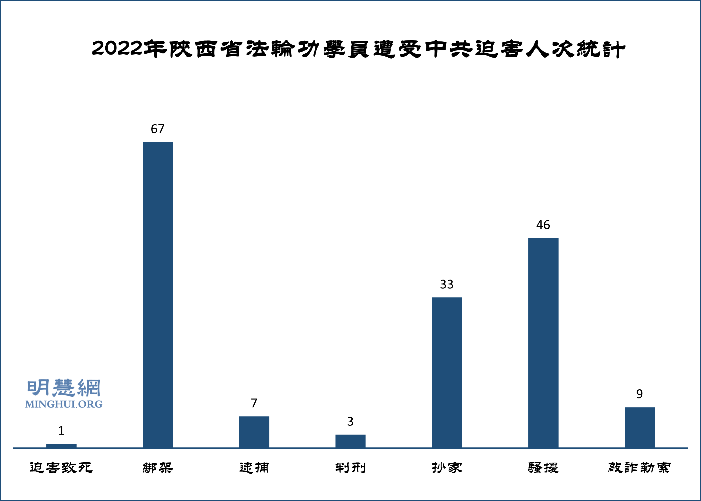 据明慧网报道的不完全统计,2022年陕西省法轮功学员至少有166人遭受中共各种迫害。其中1人离世;3人被非法判刑;67人(次)被绑架……