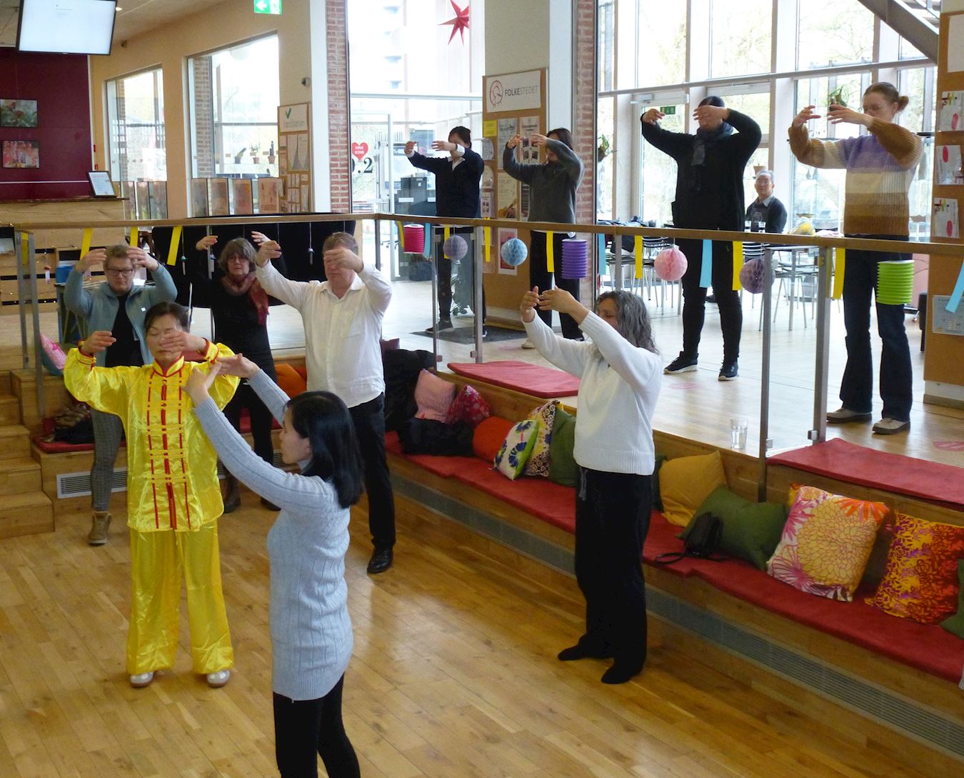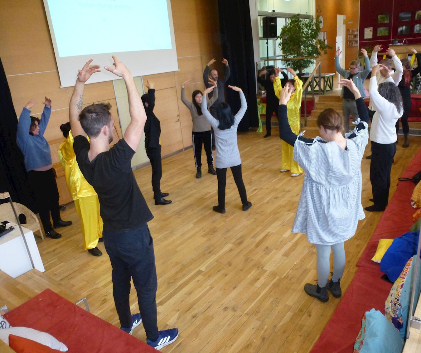 接下来新老中西方学员集体炼功,没学过功的人也很有兴致地加入跟着学炼。大家都感受到祥和宁静的能量场。