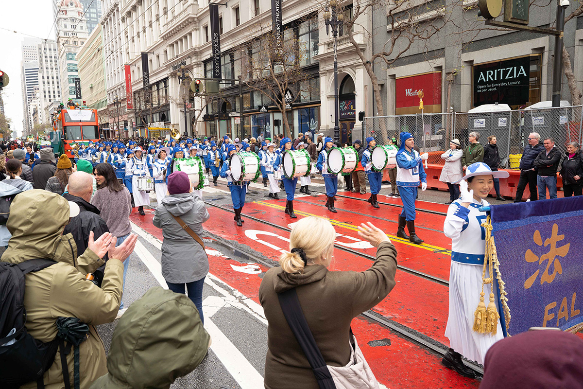 【明慧网二零二三年三月十二日】(明慧记者王英旧金山报道)二零二三年三月十一日上午,由法轮功学员组成的美西天国乐团参加了旧金山第一百七十二届圣派翠克日大游行(St Patrick's Day Parade)。第一次看到法轮功学员队伍的大陆移民说,“很壮观,非常整齐。”