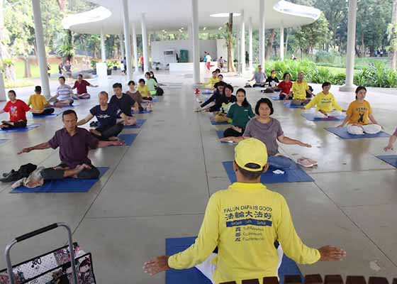 三月二十二日雅加达法轮功学员聚集在南部德贝特绿色公园的南亭,集体炼功,传播法轮功真相,并提供免费教功,受到了民众的欢迎。