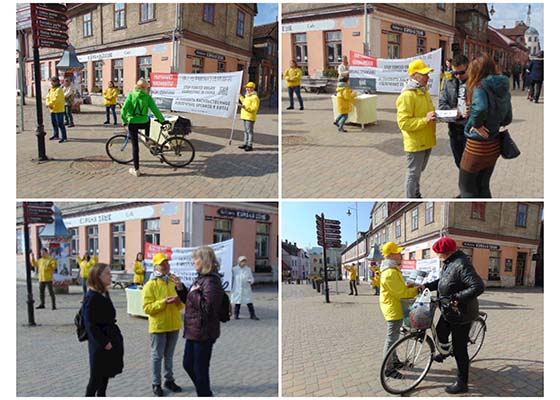 四月八日,拉脱维亚法轮功学员在库尔迪加市政厅旁边举行活动,向人们介绍法轮大法,并揭露中共在中国对大法学员的迫害。