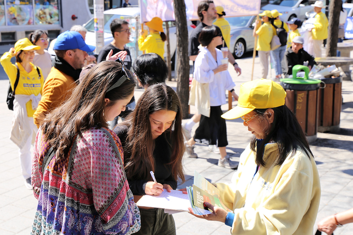 在集会现场,法轮功学员打出了大型横幅:“天灭中共 退党、团、队保平安”、“制止中共活摘法轮功学员器官”、“法轮大法好”、“真善忍好”等。法轮功学员用中、英、法三种语言向过往民众揭露中共罪行,呼吁人们,天灭中共在即,赶快远离中共、退出中共组织。期间穿插着天国乐团气势雄壮的演奏。现场正气十足,过路民众纷纷签名,表达支持。