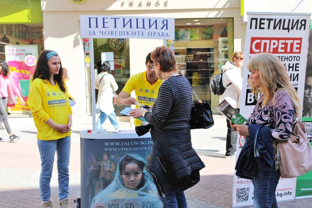 两名普罗夫迪夫音乐学院的学生停下来,接受了学员递给她们的真相小册子。她们看了真相资料,想了解为什么会发生迫害。学员告诉她们,一九九九年,法轮功修炼者人数近亿,超过中共党员人数,时任中共党魁的江泽民出于嫉妒和恐惧心理,发动了对法轮功的迫害。