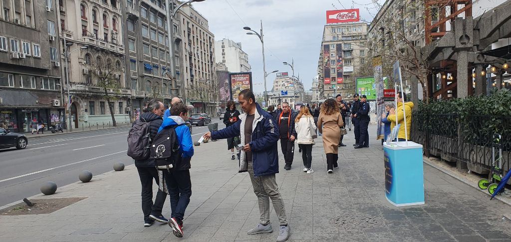 图1:二零二三年四月八日,罗马尼亚布加勒斯特的戈尔日(Gorj)广场的法轮功展位。三位学员在演示功法,一位学员向路人介绍大法修炼的详细情况,另一位学员在发放传单。