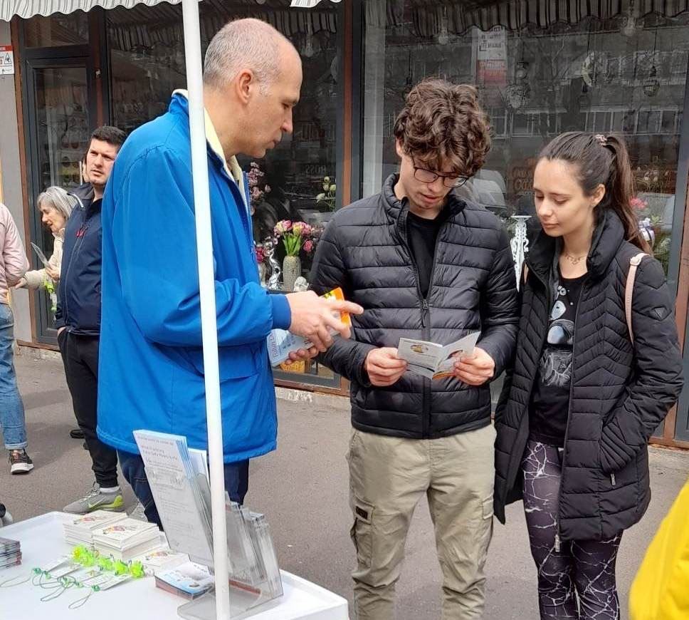 图5:二零二三年四月八日,一名学员在戈尔日(Gorj)广场的展位上告诉人们法轮大法。