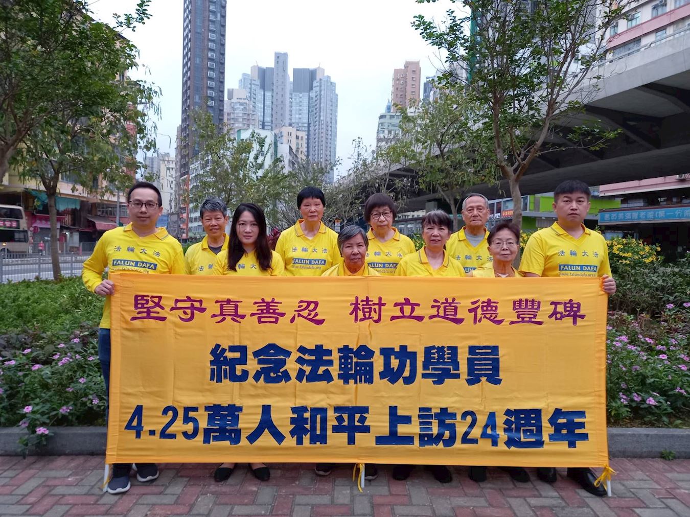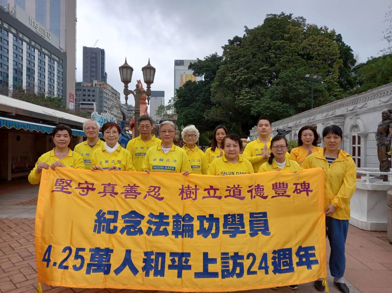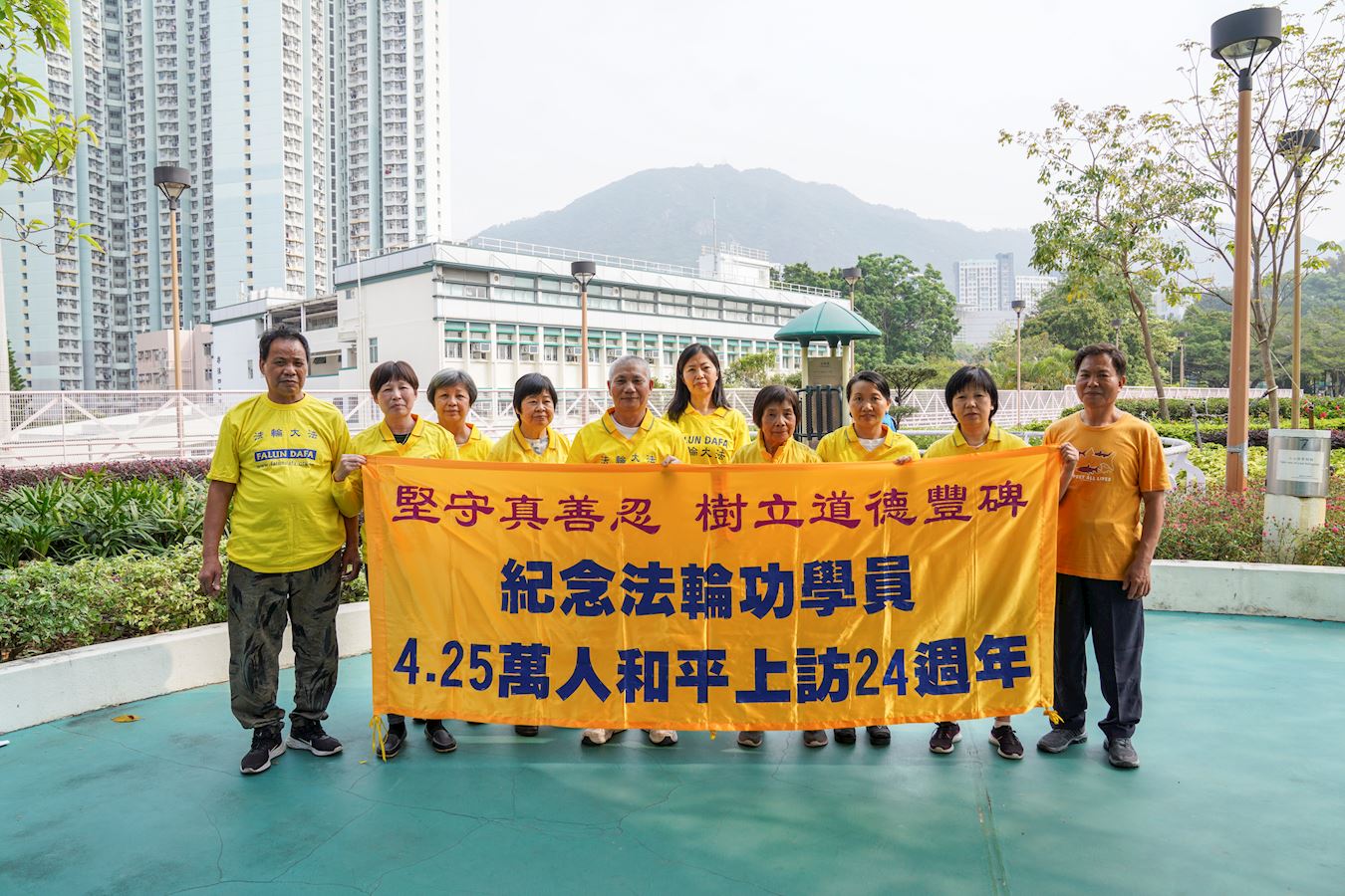 【明慧网二零二三年四月二十一日】今年四月二十五日是一九九九年万名法轮功学员和平上访二十四周年,部分香港法轮功学员在“四·二五”前举办多个小型纪念活动,在炼功点举起写有“坚守真善忍树立道德丰碑”的横幅。他们表示,“四·二五”上访展现了法轮功学员坚持正义良知的精神,并强调在邻近中国大陆的香港纪念“四·二五”,对于揭露中共谎言尤其重要。