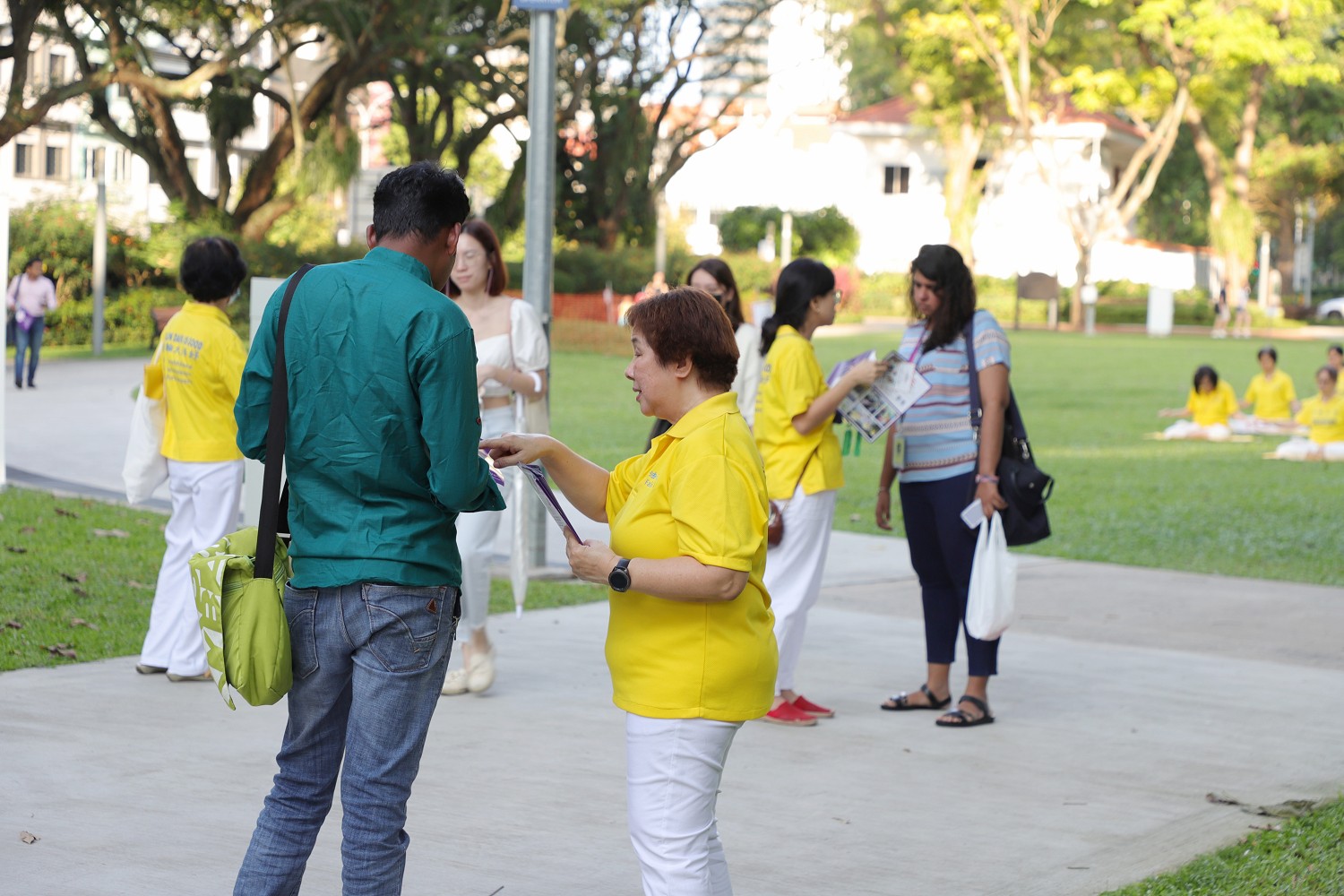 当天途经活动现场的民众有来自意大利、荷兰、澳洲等国的游客,也有来自周边马来西亚、印度尼西亚、印度、孟加拉国等地在新加坡的工作人士。很多人接过学员传递的真相资料,驻足与学员交谈;也有人在了解详情后,希望学炼功法;还有不少人举起手机拍照,记录下平静祥和的炼功场面。