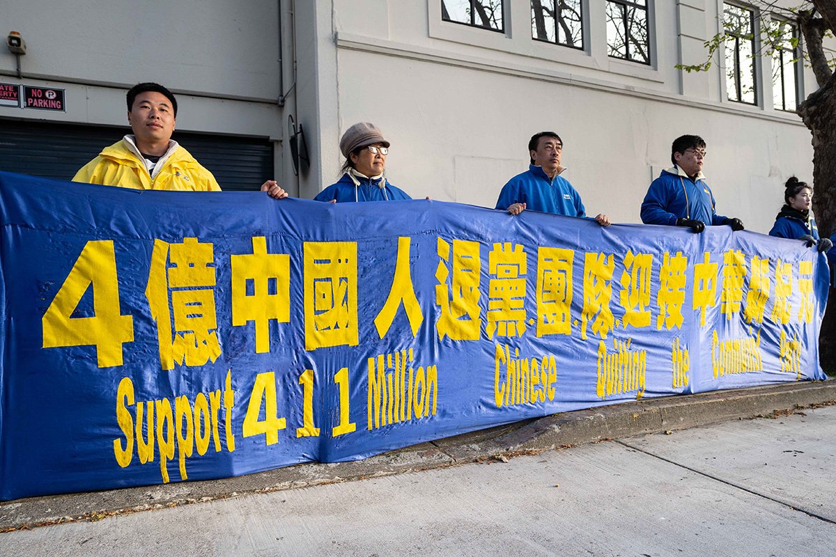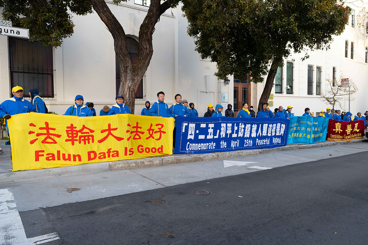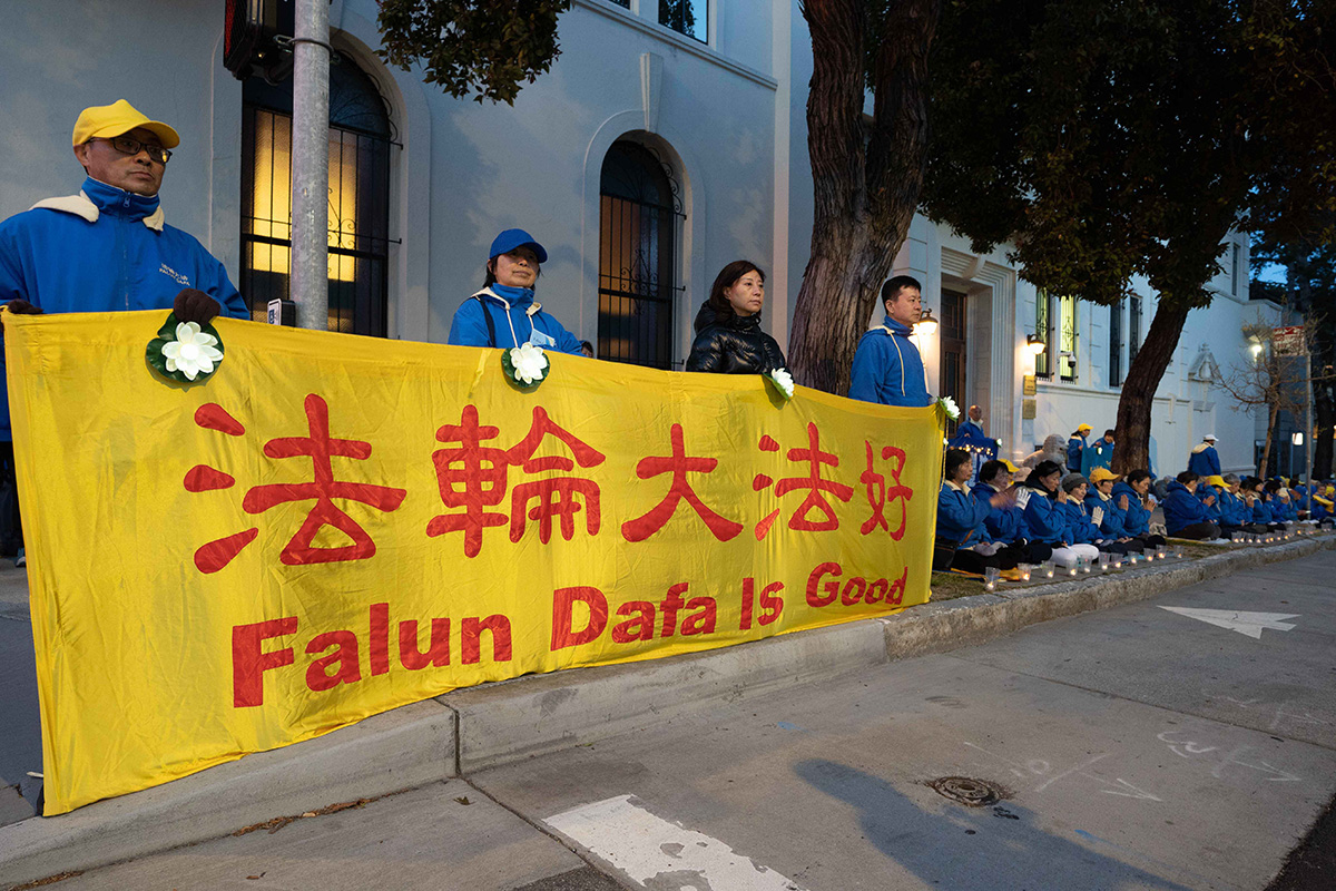 四月二十三日晚,法轮功学员在中共驻旧金山总领事馆前,纪念“四·二五”和平上访二十四周年。他们点燃蜡烛,悼念二十四年来遭中共迫害致死的法轮功学员。