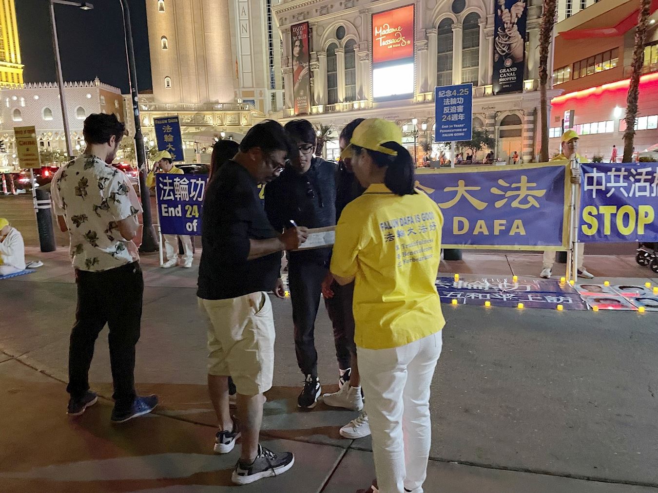活动中,学员们着装整齐,有的打横幅,有的展示法轮功的五套功法。熙熙攘攘的游客,被法轮功学员祥和的炼功场面和音乐吸引,纷纷在真相展板和横幅前停步,认真阅读文字,接受学员递过来的传单;不赶时间的游客就在《解体中共》的征签表上签名,支持法轮功。