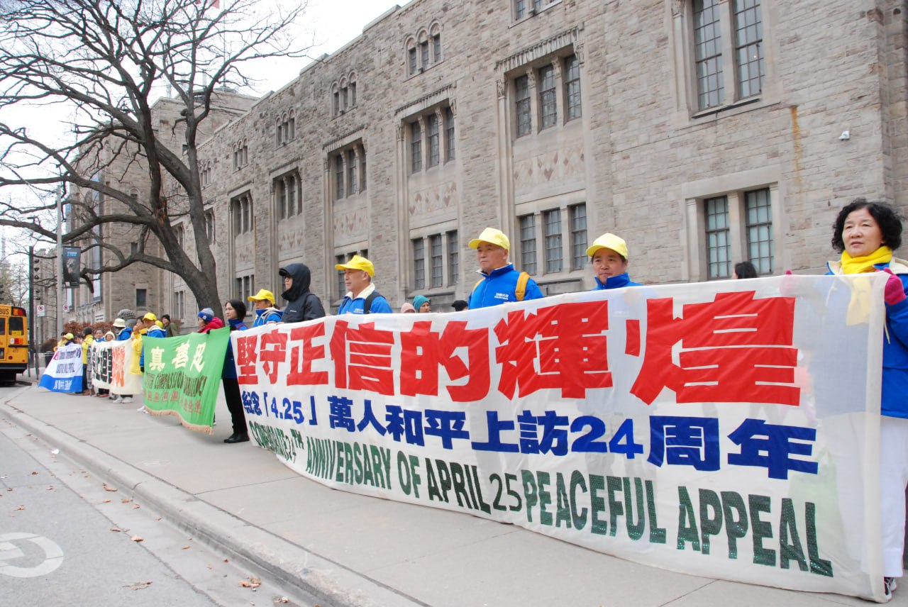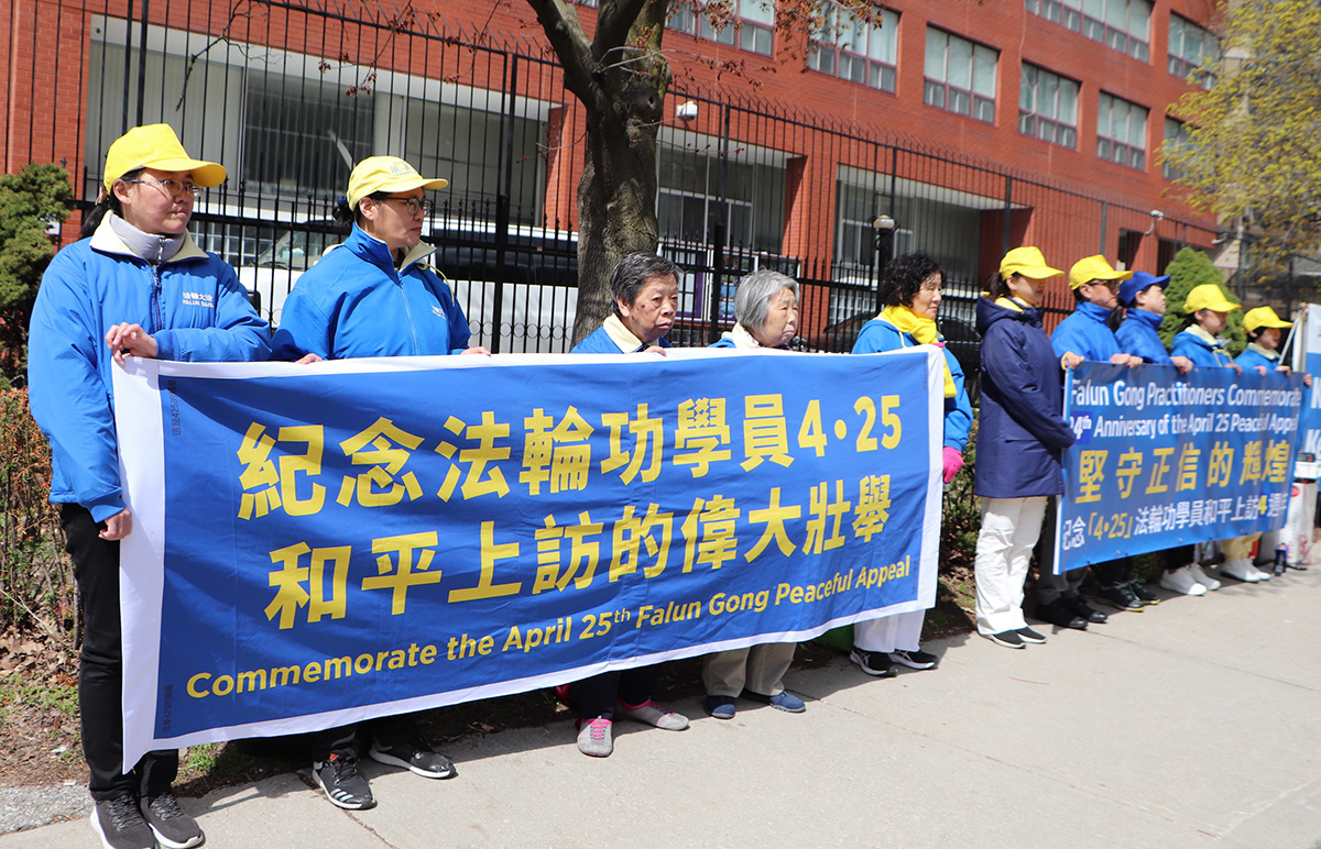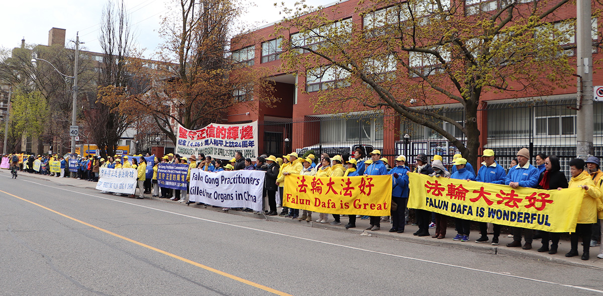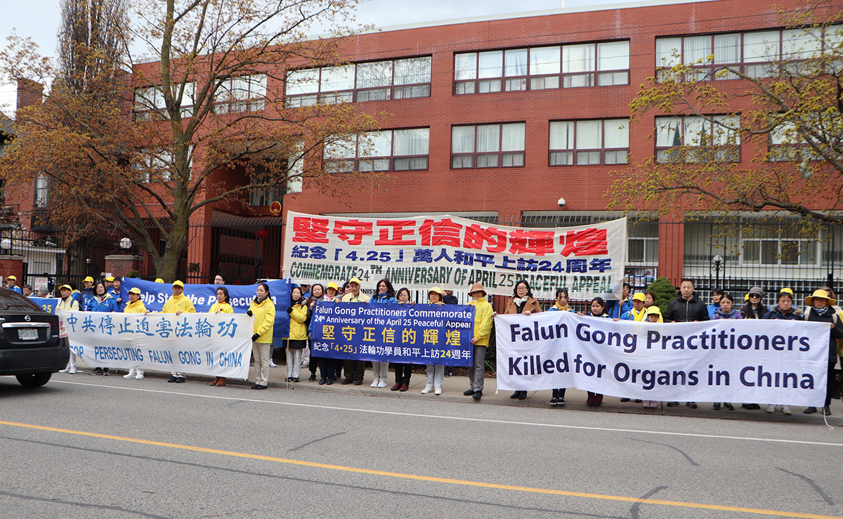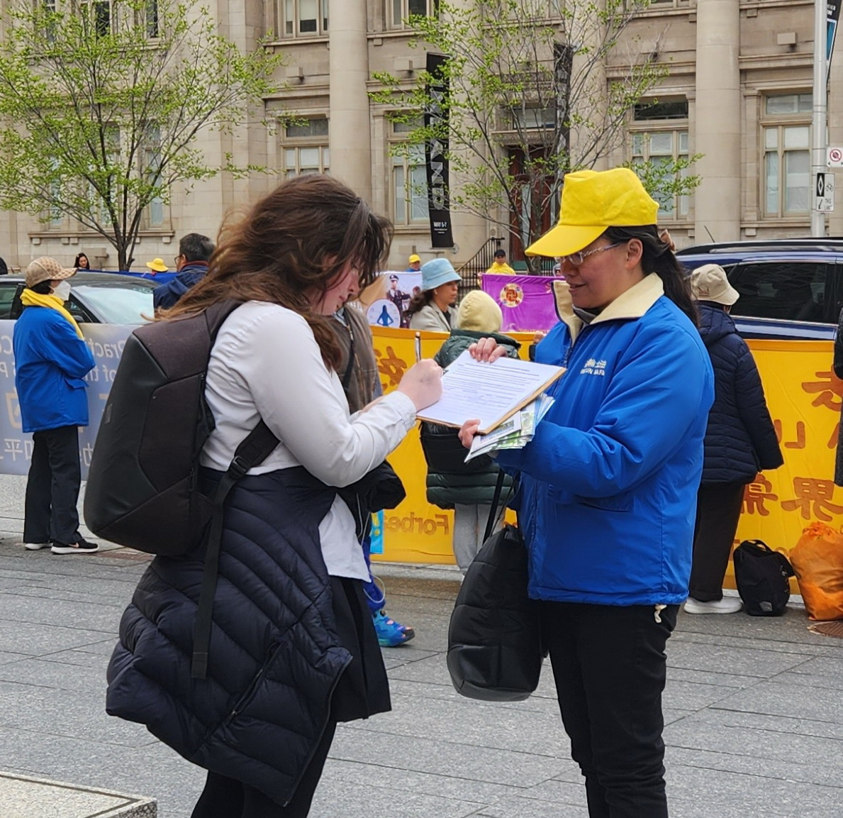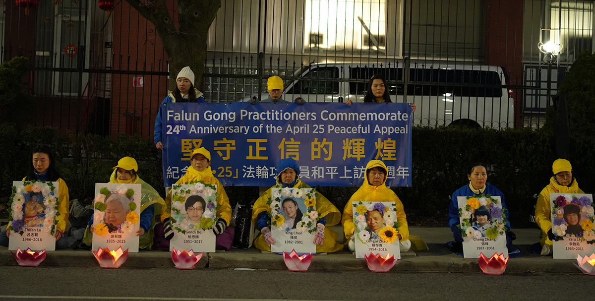 当天上午十一点法轮功学员在中领馆前举行了集会,中午三点在市中心的主要十字路口拉横幅和征签,向民众讲述着真相;晚上八点在中领馆前点燃蜡烛,悼念二十四年来遭中共迫害致死的法轮功学员。