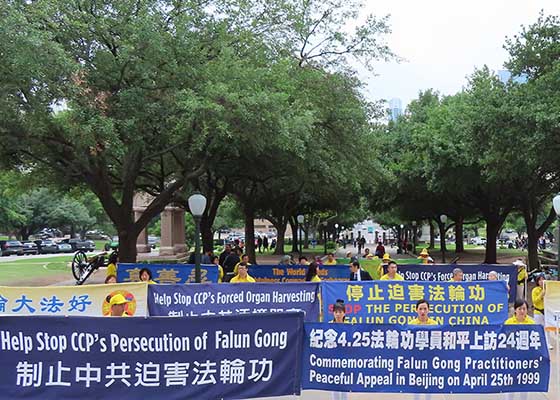 四月二十五日,来自美国德州四个主要城市的法轮功学员在州议会大厦前举行集会,纪念万名法轮功学员在北京和平上访。多位州议员来到集会现场表示支持。