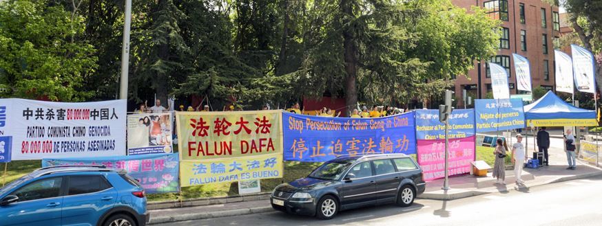法轮功学员在中共驻西班牙大使馆前竖立起长排横幅:“纪念四·二五 法轮功和平上访二十四周年”、“停止迫害法轮功”、“强烈谴责中共活摘法轮功学员器官”、“中共暴行必遭天惩”、“法轮大法好”、“真善忍好”