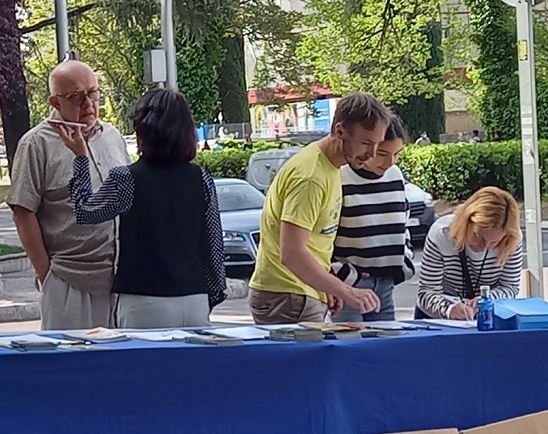 一面面醒目的横幅立刻吸引住过往行人的目光,人们停下匆匆的脚步观看反迫害图片和传单,在了解中共对信仰真、善、忍的法轮功修炼者的残酷打压,及活摘法轮功学员人体器官牟利的罪行真相后,纷纷签字谴责中共暴行,声援法轮功学员反迫害。