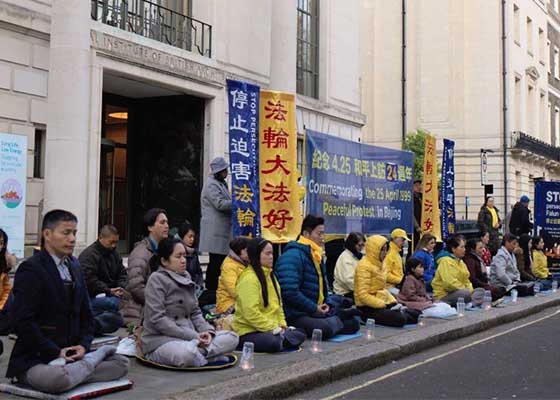 四月二十五日傍晚,英国伦敦部份法轮功学员来到中使馆对面,纪念法轮功“四·二五”和平请愿二十四周年。