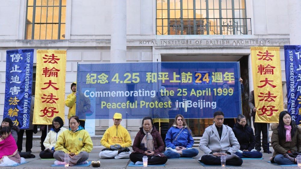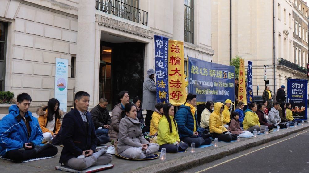 伴着傍晚夕阳的金色余晖,法轮大法《普度》的乐声回荡在伦敦的街道上,法轮功学员在中共领馆前拉起多条横幅:“纪念四·二五和平上访24周年”、“停止迫害法轮功”、“法轮大法好”等。学员们还点燃起烛光,悼念一九九九年以来被中共迫害致死的法轮功学员。