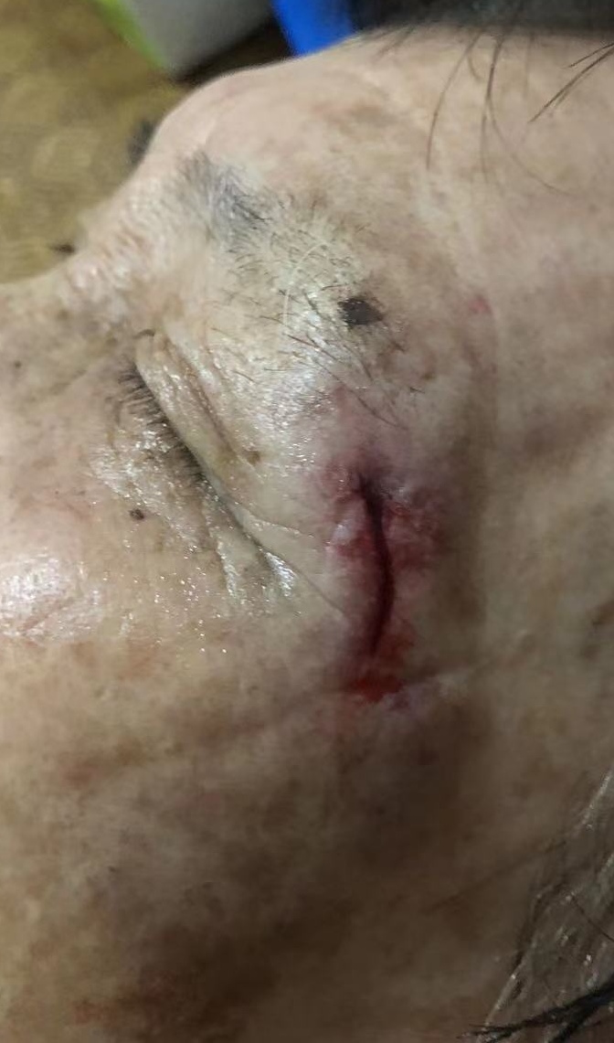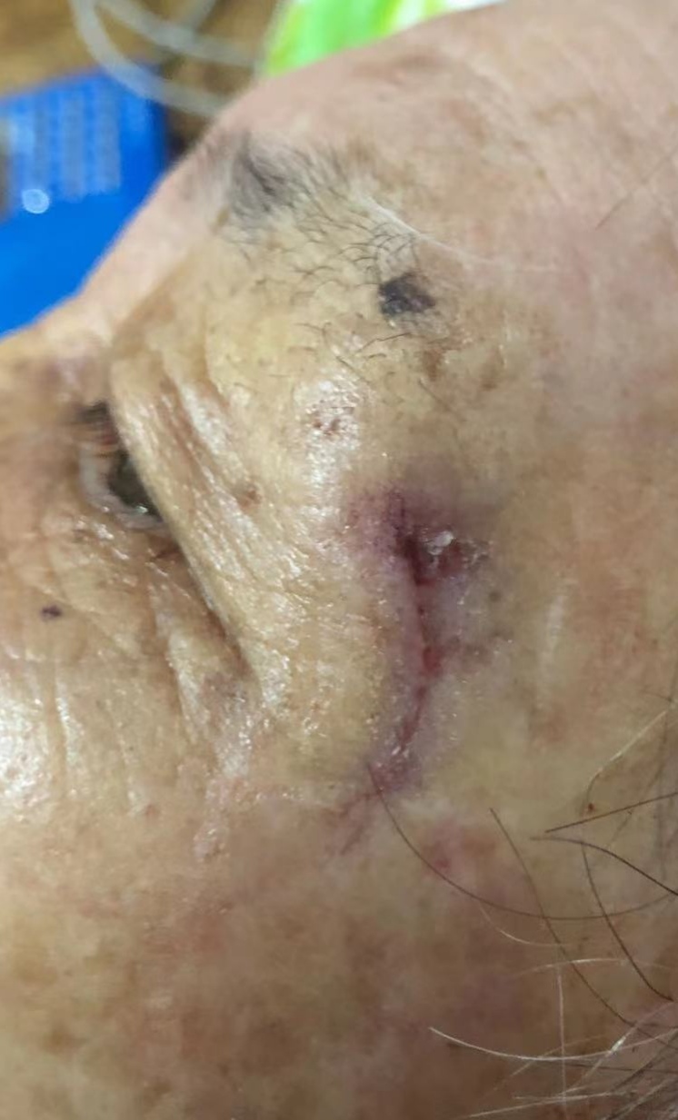 还有一次是二零二二年六月中旬一天,母亲从床上起来时,突然被一股强大的力量猛的推向门框,左眼外上方砸到门框突起的金属片上,然后又被冲出门外,扑倒在地。姐姐同修听到巨响赶紧進屋,一看满地是血,扶起母亲见她左眼睛上方一道又深又长的口子,正在不断流血,擦拭了很多手纸也止不住,后来经过长时间按压才止住了。家人赶回看后说:这个口这么深,不去医院缝合不行(见图1)。可母亲坚决不去。我们只好把伤口清洗干净,然后用创可贴敷上。第三天我们打开创可贴一看,伤口基本长上了(见图2),真是恢复的太快了!我丈夫说:“别说九十多岁的人了,就是年轻人也不会这么快就长上啊。真是太神奇了!”大约十天之后再看伤口,几乎连疤都看不到了(见图3)。