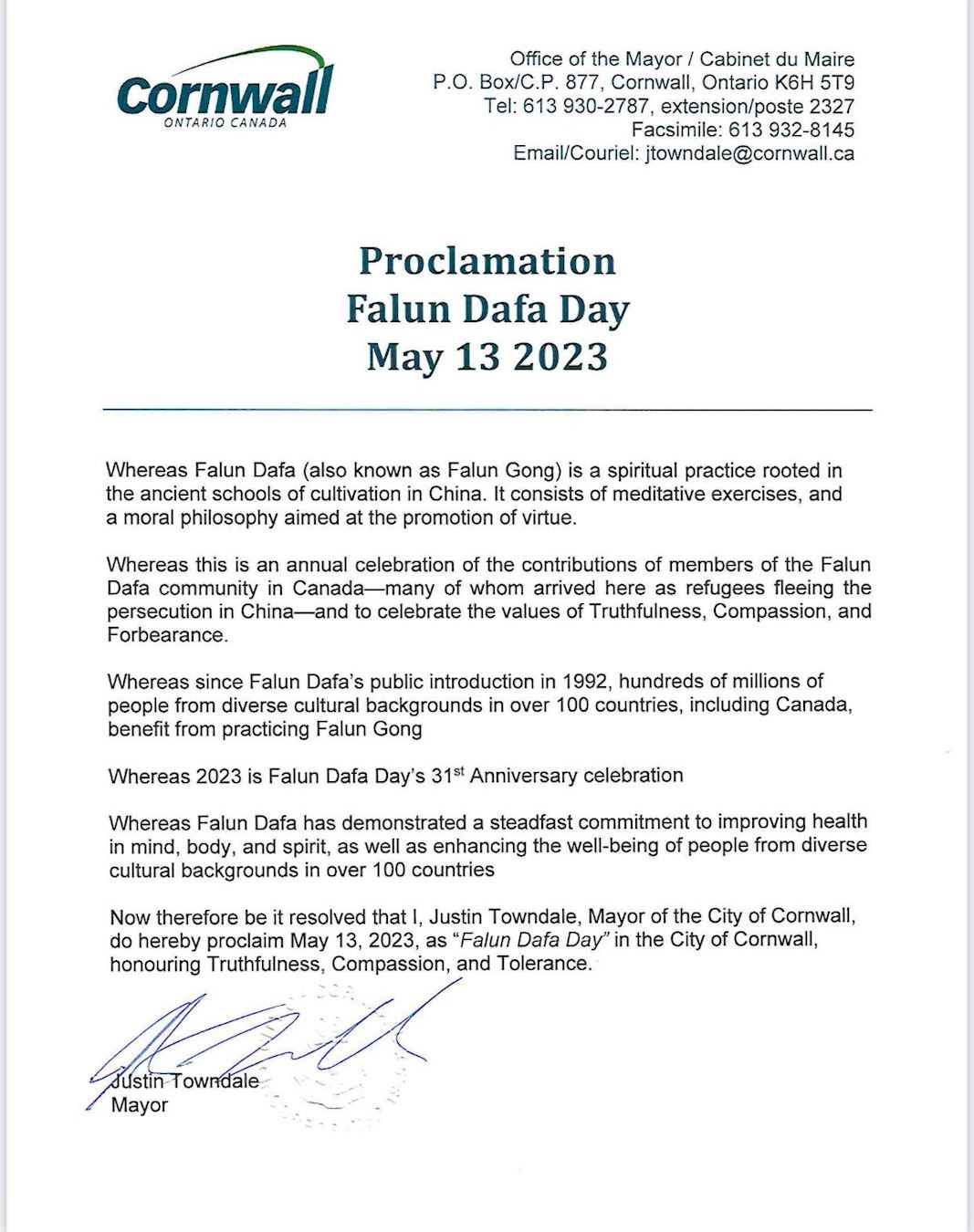 “现在,我,康沃尔市市长贾斯汀·汤戴尔,特此宣布二零二三年五月十三日为‘法轮大法日’,以表示对真、善、忍理念的敬意,我们全心全意地欢迎这一理念加入我们的小区。 ”