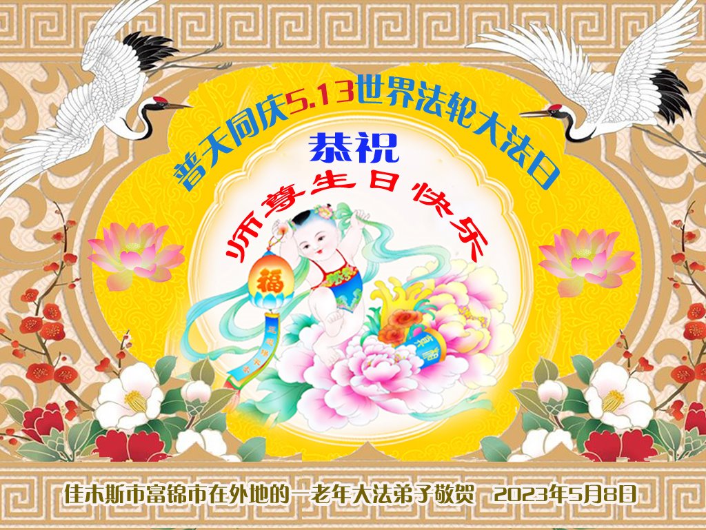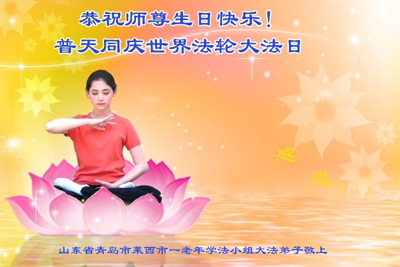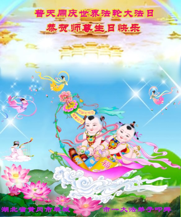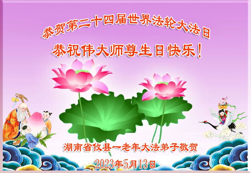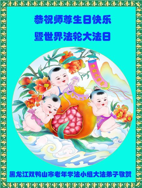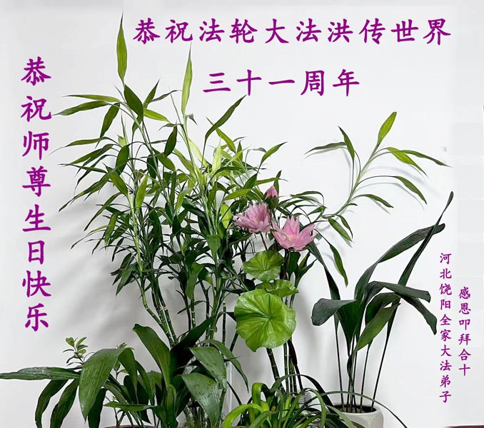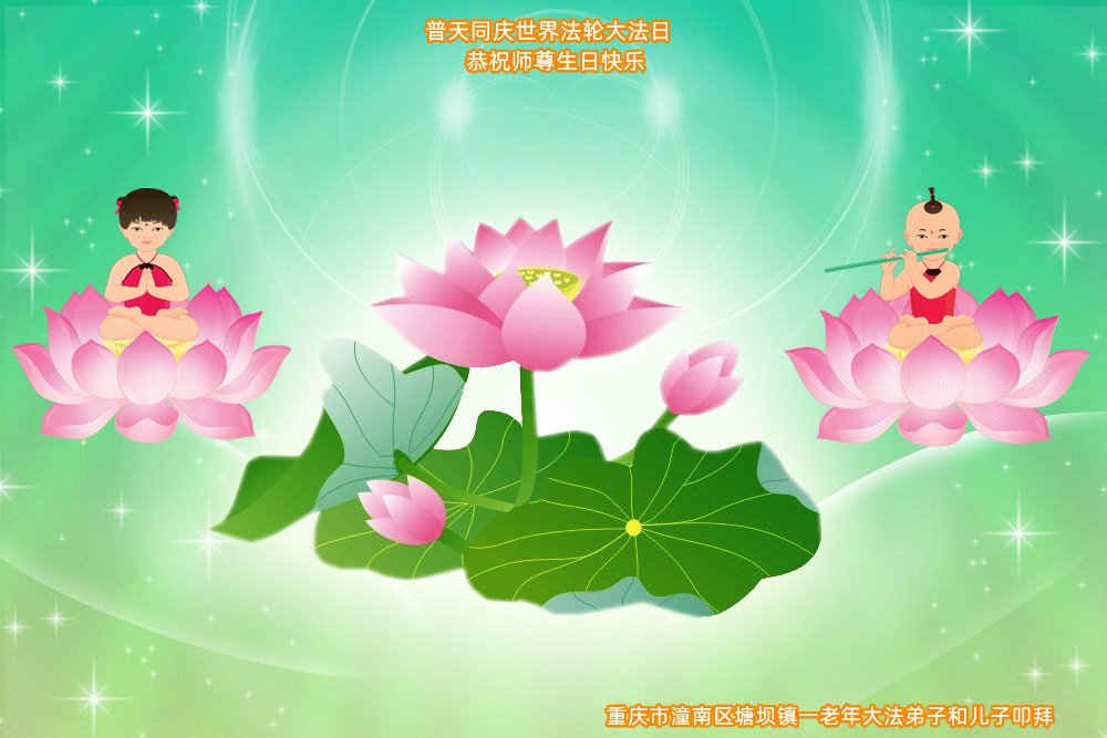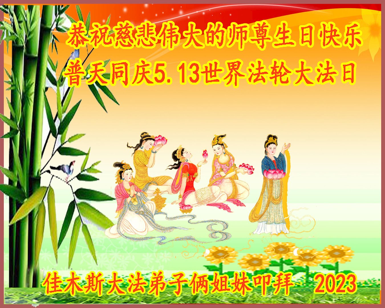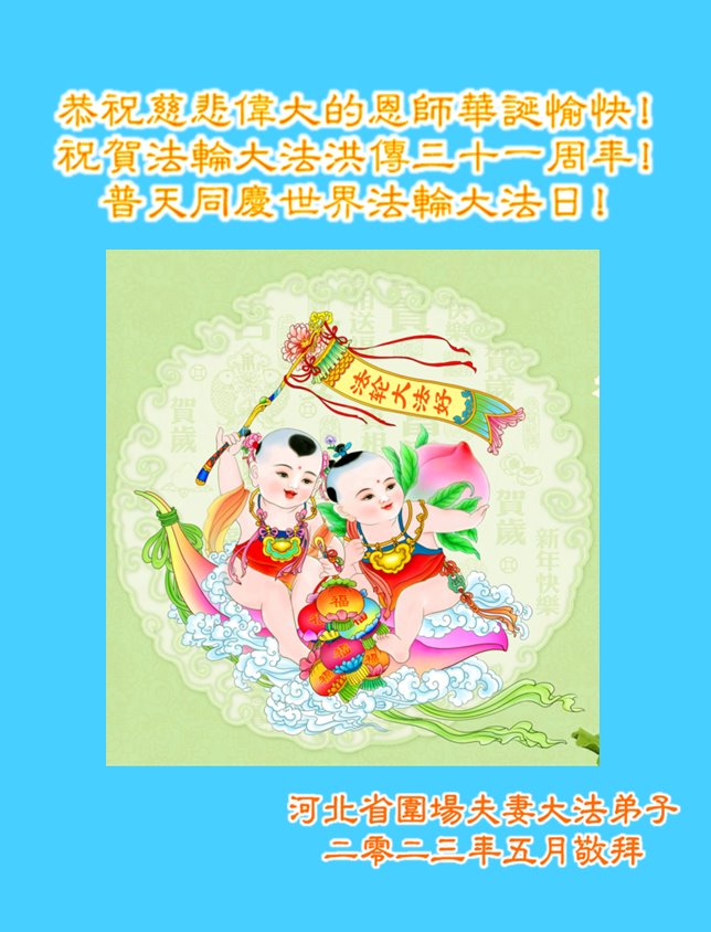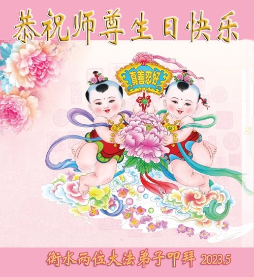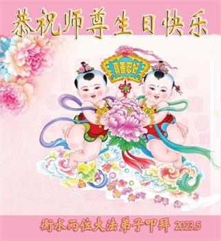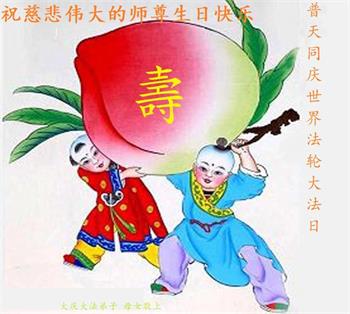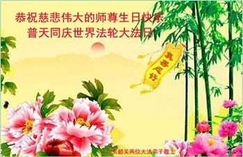 在普天同庆世界法轮大法日的殊胜日子里,我们俩老年大法弟子真诚的问声:师尊好!恭祝师尊生日快乐!感恩师尊慈悲救度!