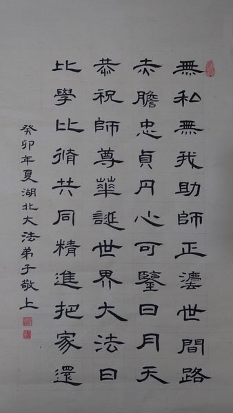 大法弟子紧随师父走过了多少不平凡的岁月!师父赐予了弟子助师正法、救度众生的神圣使命,弟子感到无比荣耀!无论修炼的路上还有多少险阻、多少风雨,弟子坚信,有大法的引领,有师父的慈悲保护,弟子一定能正念正行,多学法,学好法,修好自己,努力做好三件事,救度更多的众生,兑现来世的誓约,圆满随师还!
