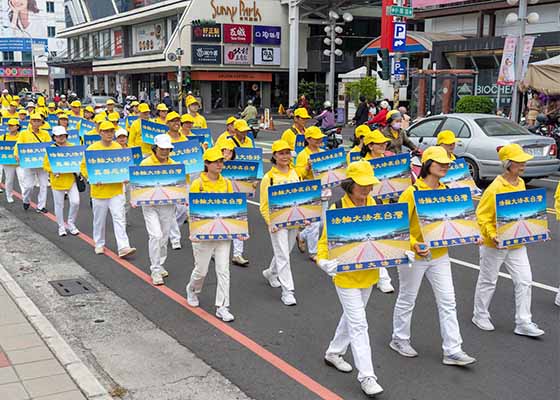 五月十三日世界法轮大法日,来自南台湾高雄、屏东、台东、金门、澎湖县市的部份法轮功学员,齐聚屏东市千禧公园,环市中心游行弘法。