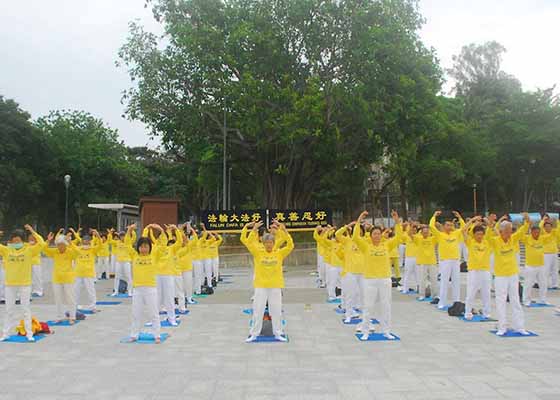 五月一十三日,庆祝世界法轮大法日,台湾嘉义法轮功学员集体炼功弘法,讲法轮功真相,市民感谢学员传播真相,赞许道:法轮功学员都很善良。