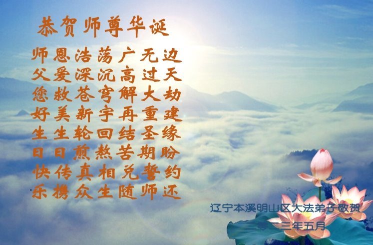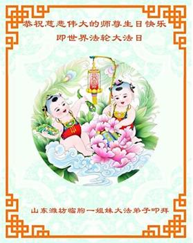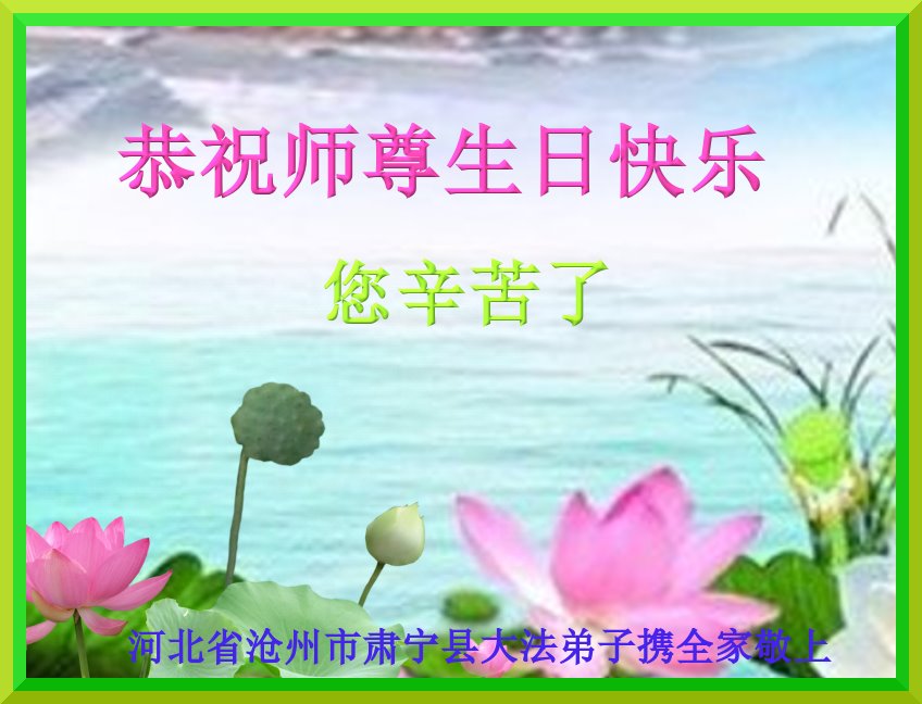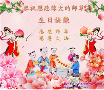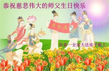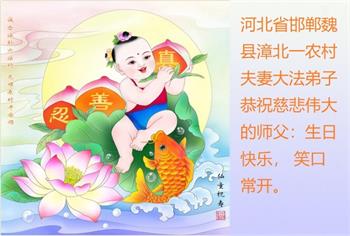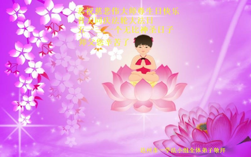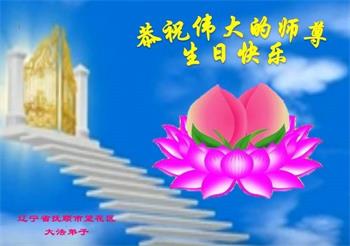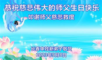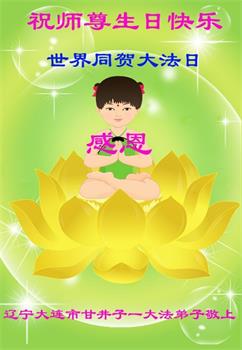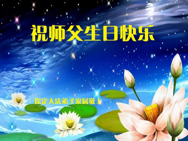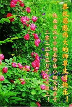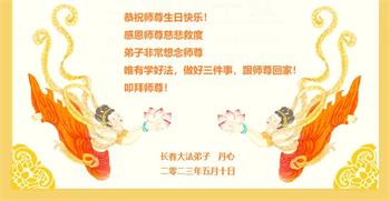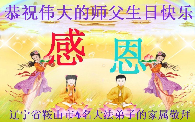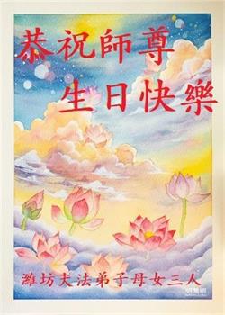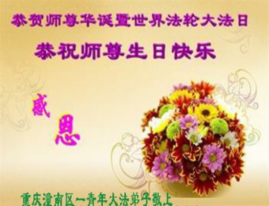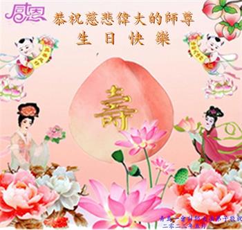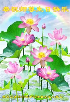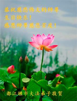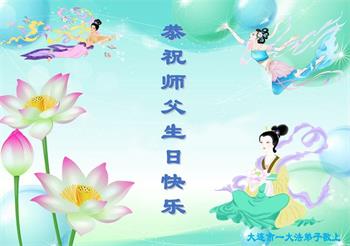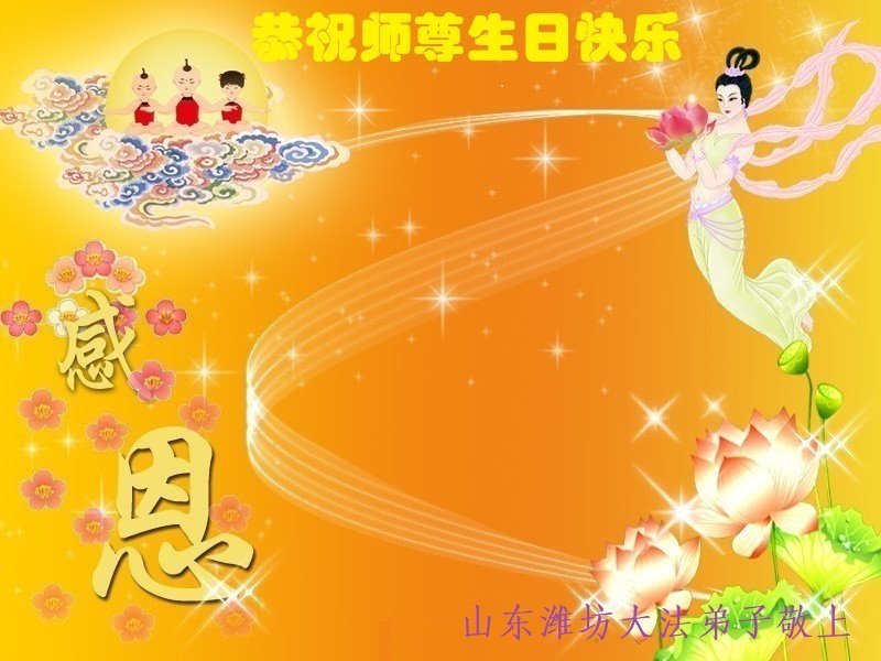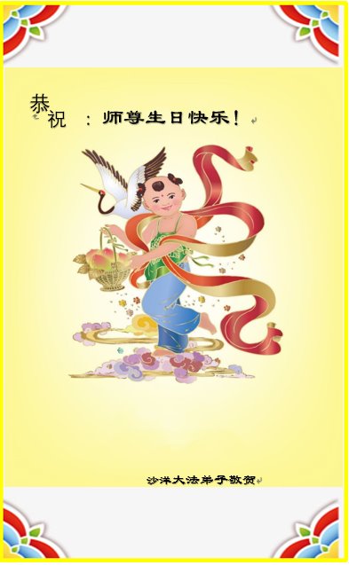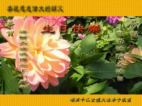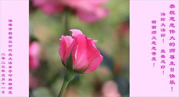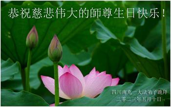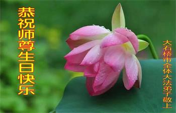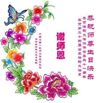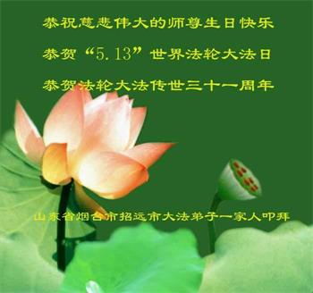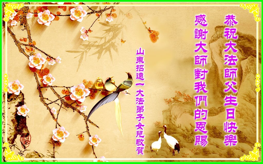 尊敬的师父好:我是昔日的小弟子,现在已成为一名青年弟子。是师父您在弟子千钧一发之际,使弟子躲过了一场车毁人亡的大劫。弟子感恩师父的救命之恩,弟子今后按照师父的大法标准去做,一定会成为一名合格的大法弟子。谢谢师父的保护与怜慈!祝愿师父生日快乐!