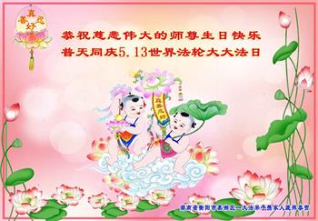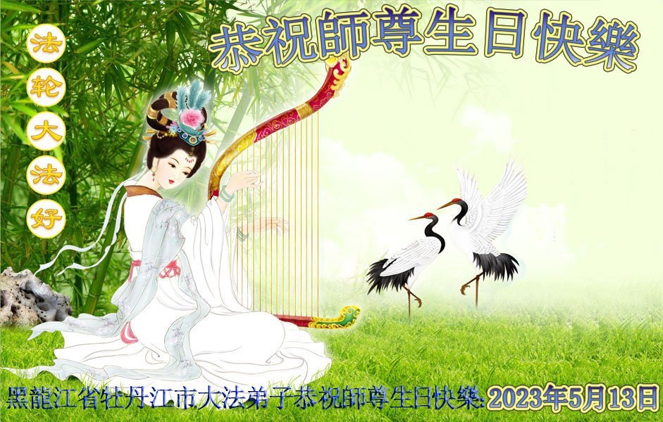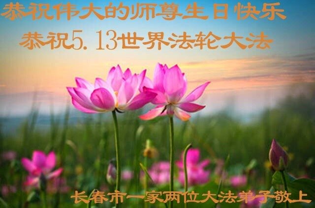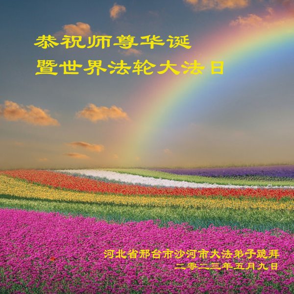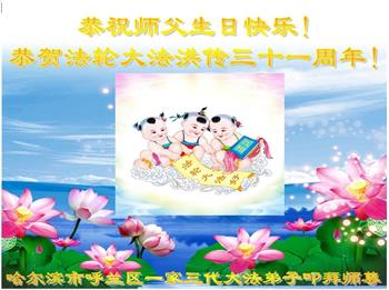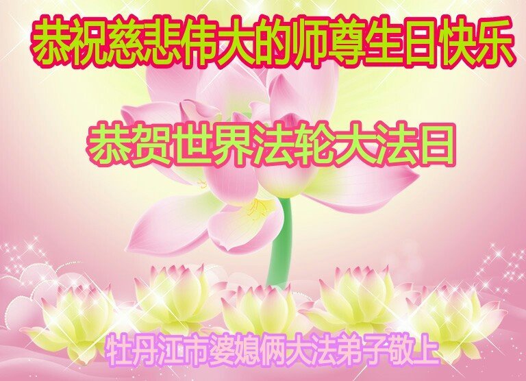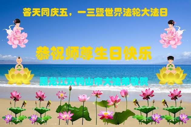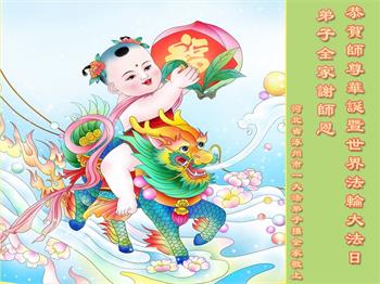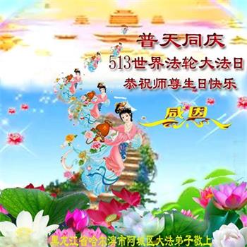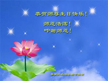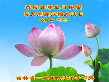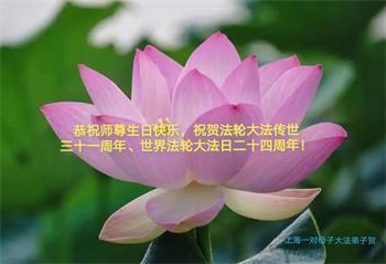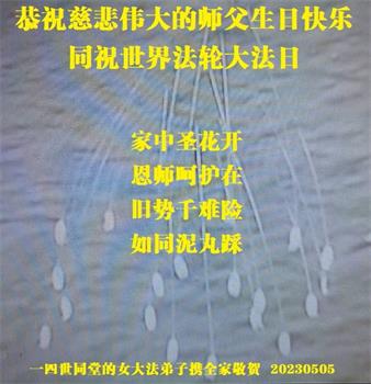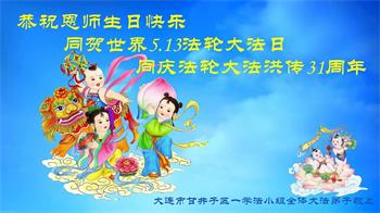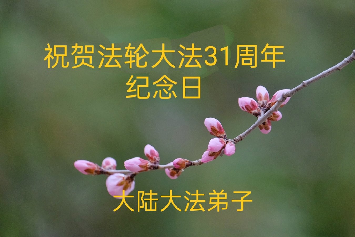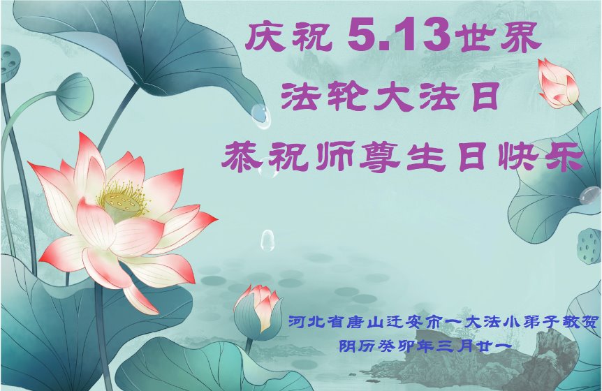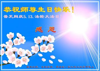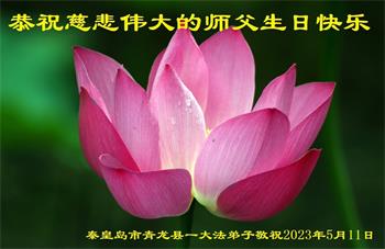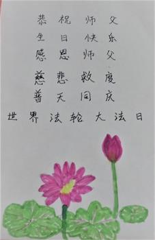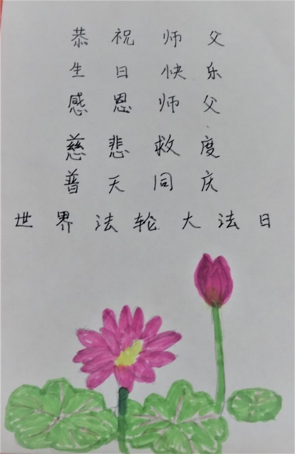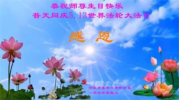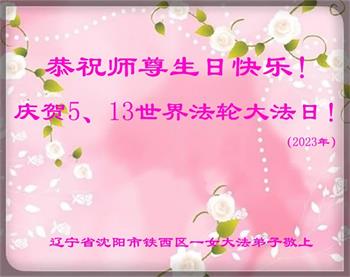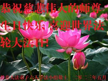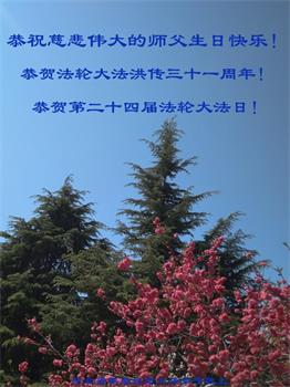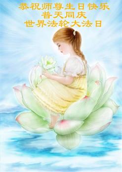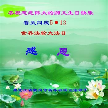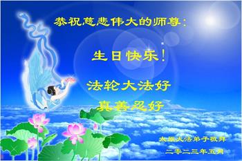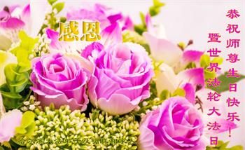 慈悲伟大的师父好,我九岁时就跟随着妈妈学大法。在邪恶疯狂时期,我和妈妈一起配合发资料,写标语、贴标语、挂条幅。在妈妈多次被抓、被关押期间,我没有动摇信念。至今我坚信师父、坚信大法,我非常珍惜师父赐予的“正法时期大法弟子”的神圣称号。我生逢在师父传宇宙大法时期,万分感谢师父的伟大赐予,这是我生生世世的期盼,这是我来到人世的夙愿。在普天同庆的日子里,我怀着虔诚的心感恩师父,这是无法用人类语言来表达的心境。天地同庆,万物感恩,颂歌献给师父:谢谢师父的慈悲关怀,祝师父生日快乐!祝大法洪传三十一周年!