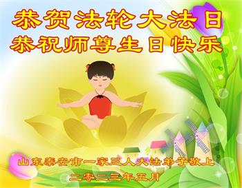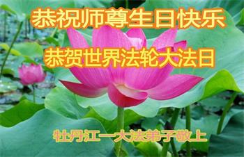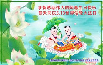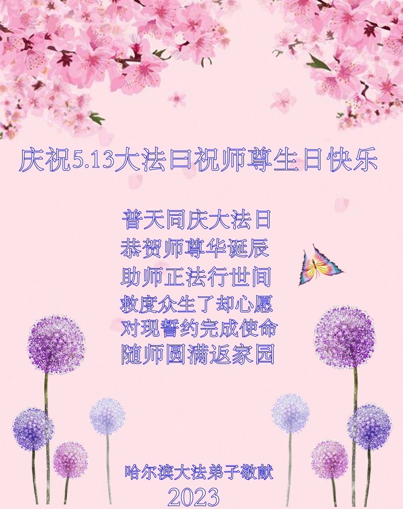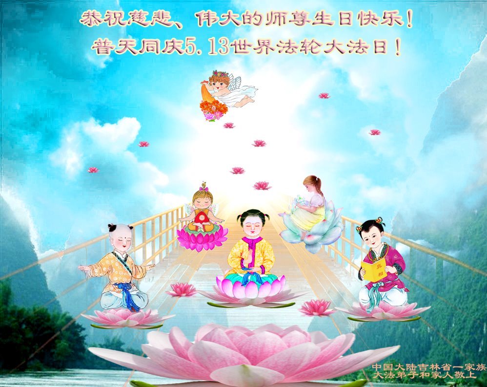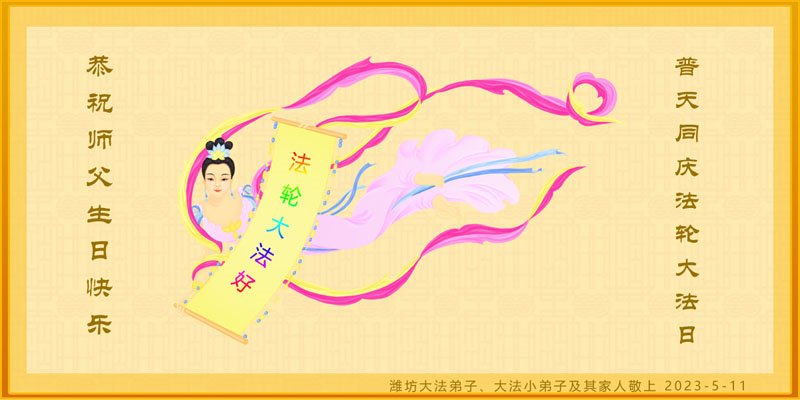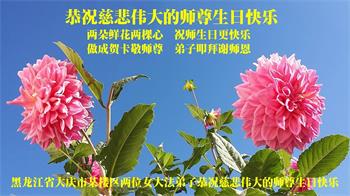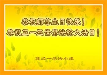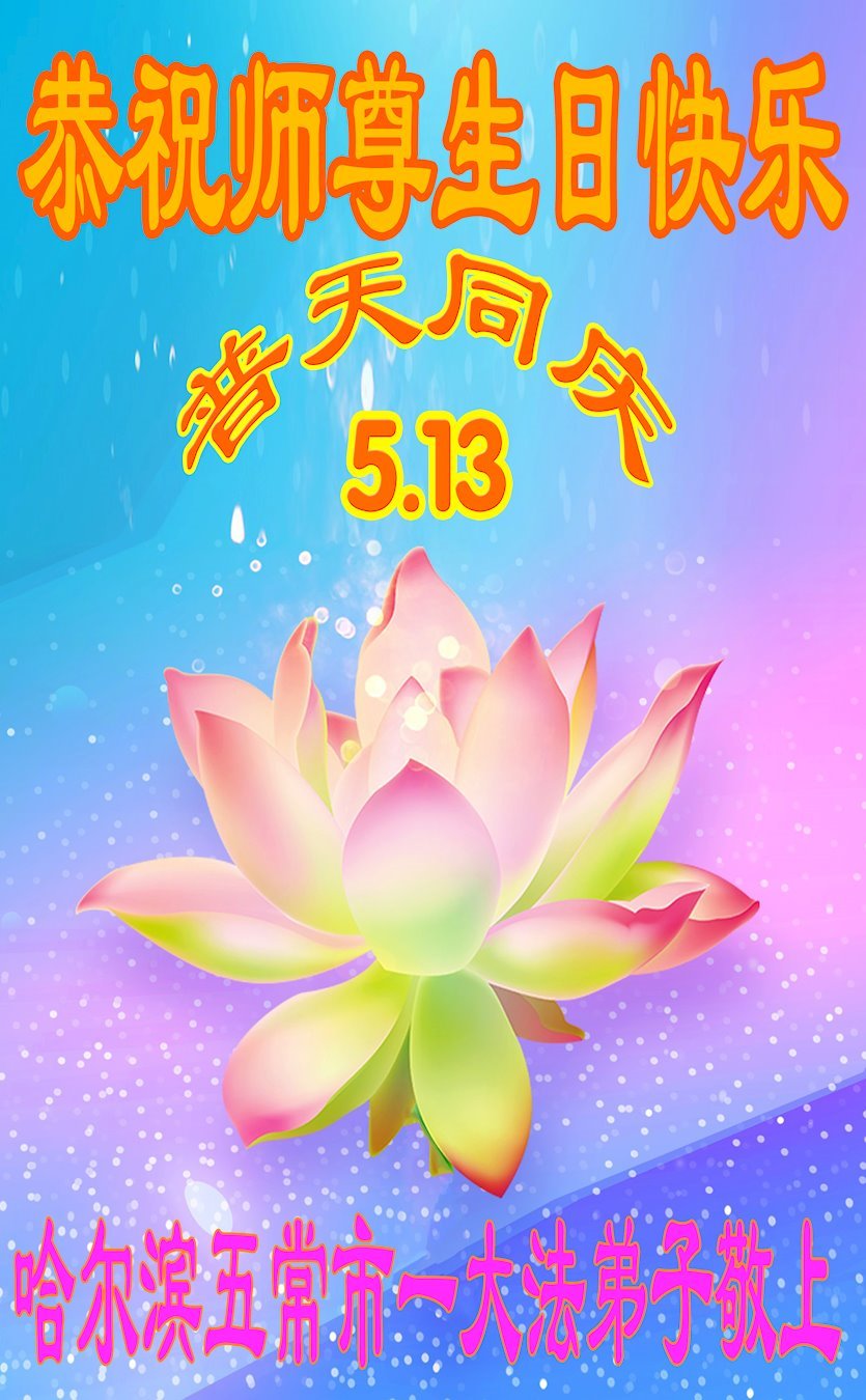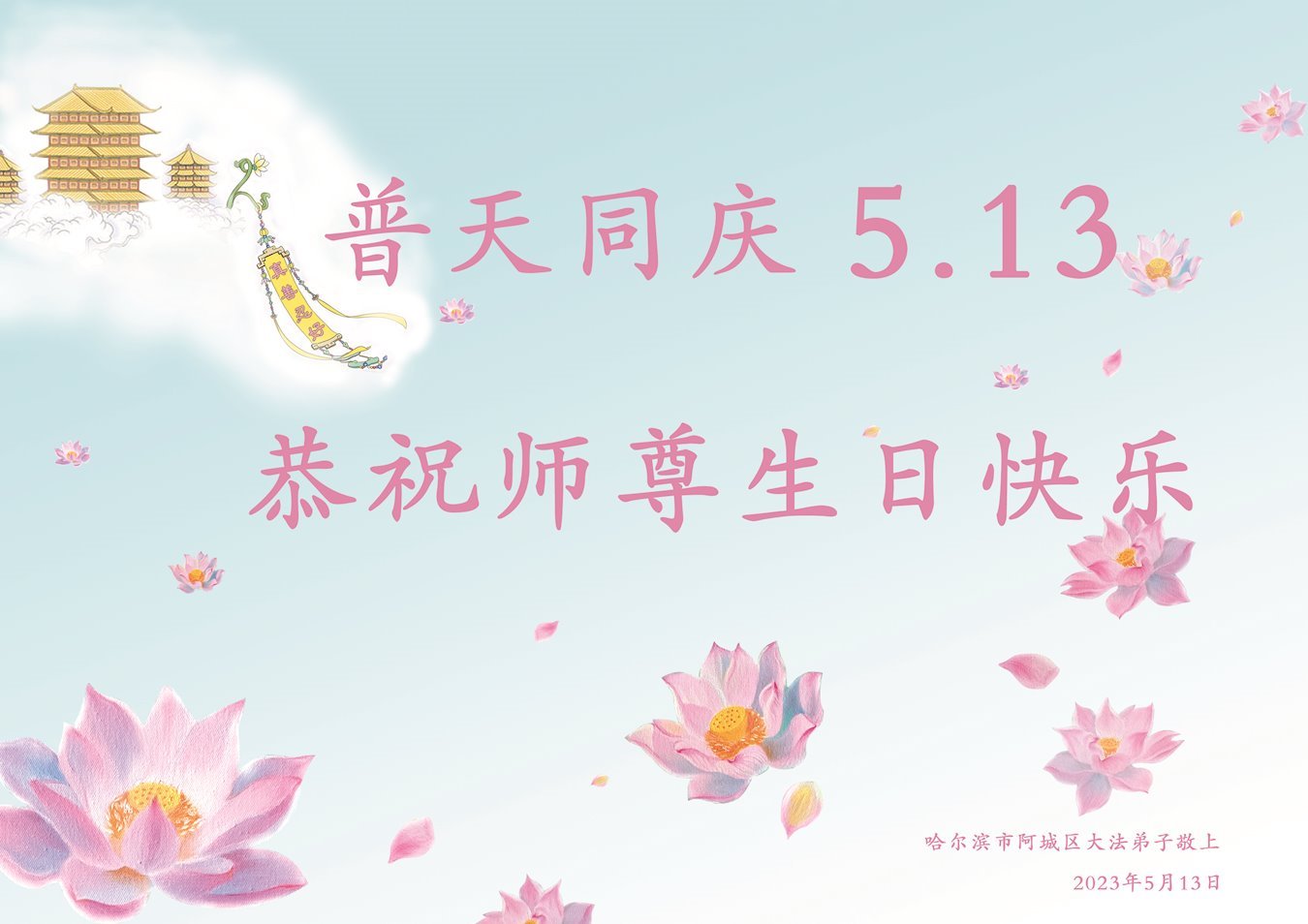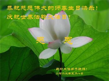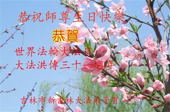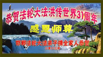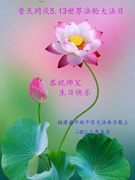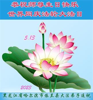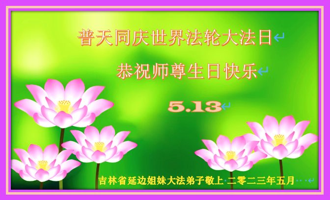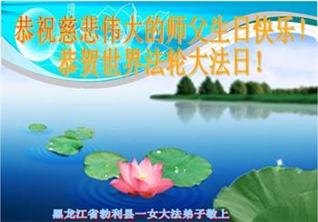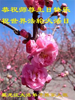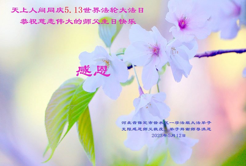 慈悲伟大的师父好,我九岁时就跟随着妈妈学大法。在邪恶疯狂时期,我和妈妈一起配合发资料,写标语、贴标语、挂条幅。在妈妈多次被抓、被关押期间,我没有动摇信念。至今我坚信师父、坚信大法,我非常珍惜师父赐予的“正法时期大法弟子”的神圣称号。我生逢在师父传宇宙大法时期,万分感谢师父的伟大赐予,这是我生生世世的期盼,这是我来到人世的夙愿。在普天同庆的日子里,我怀着虔诚的心感恩师父,这是无法用人类语言来表达的心境。天地同庆,万物感恩,颂歌献给师父:谢谢师父的慈悲关怀,祝师父生日快乐!祝大法洪传三十一周年!
