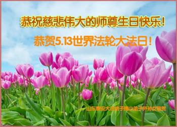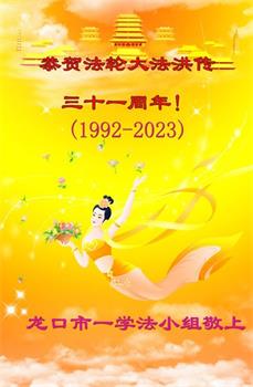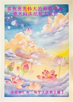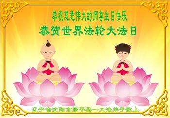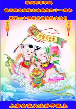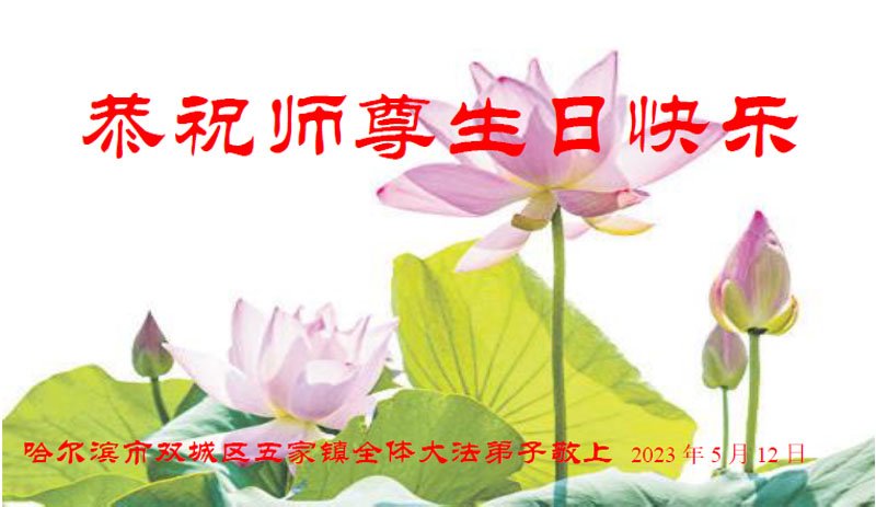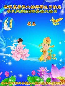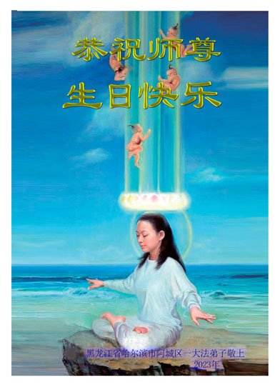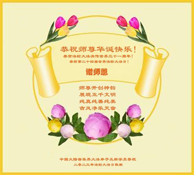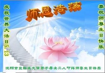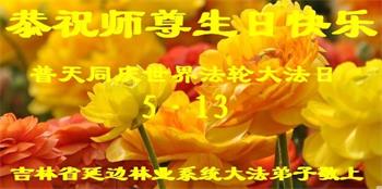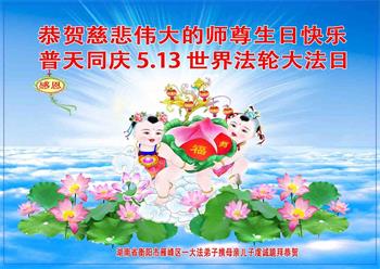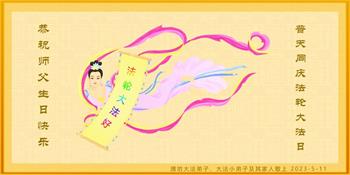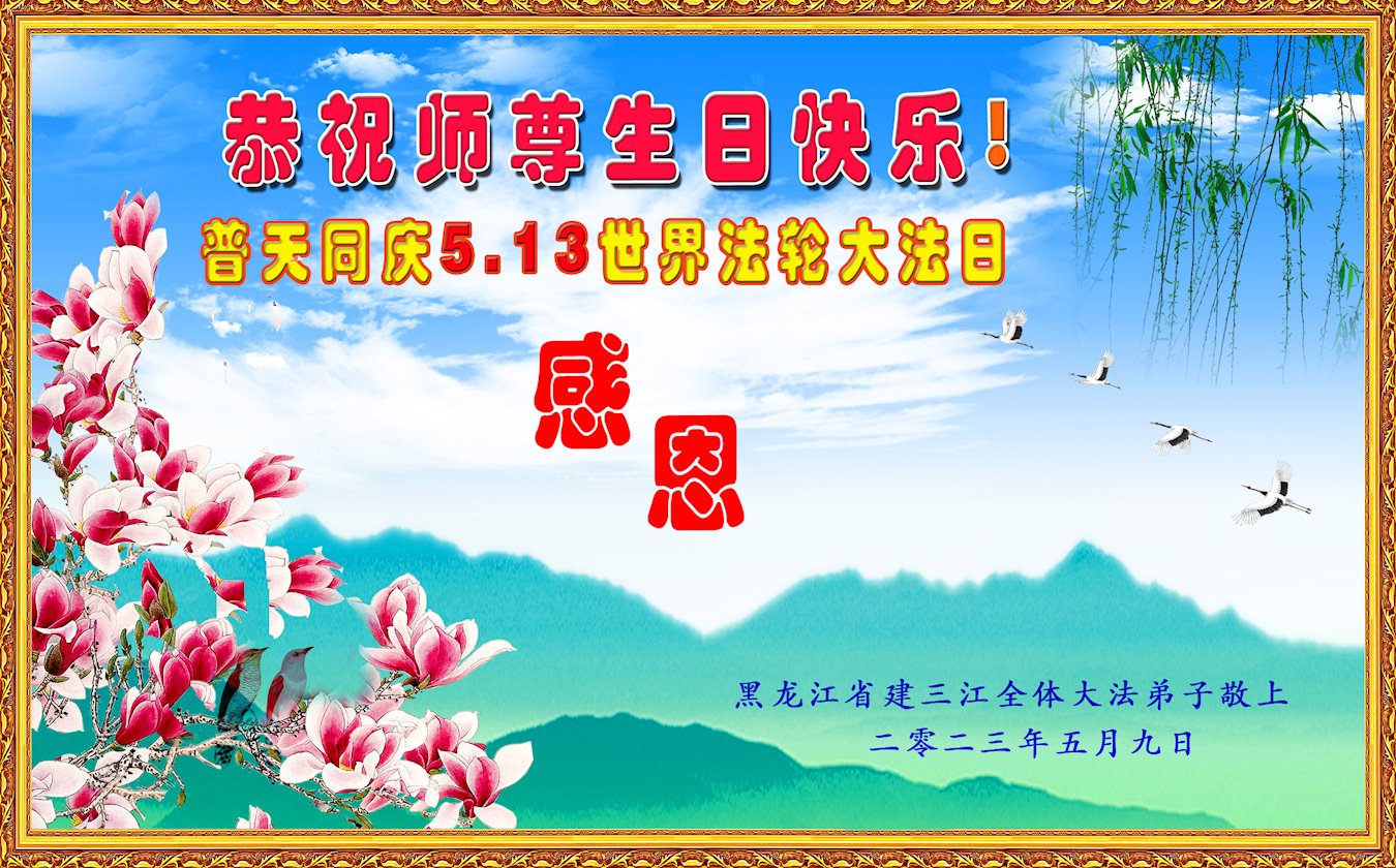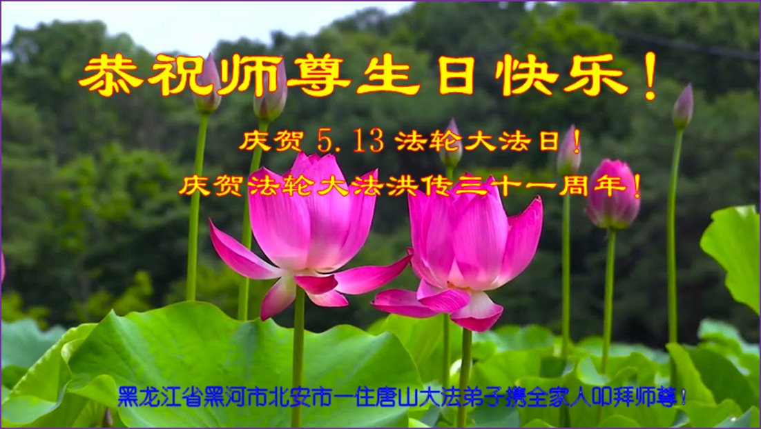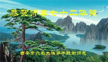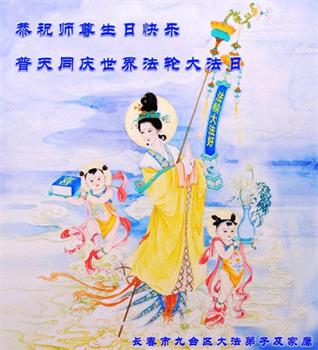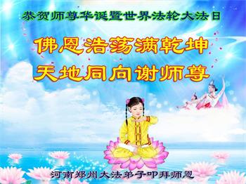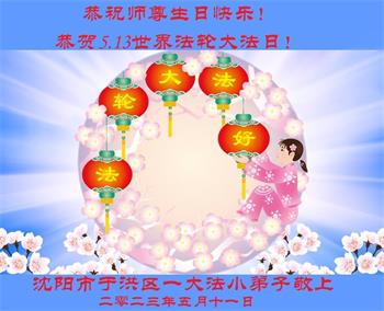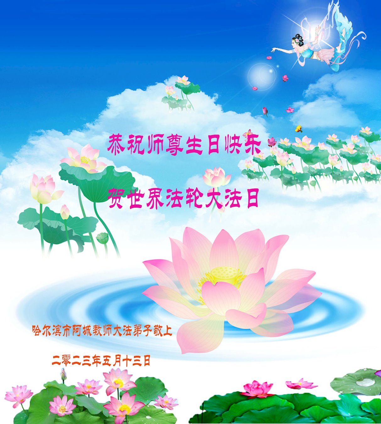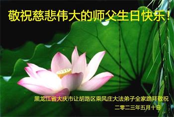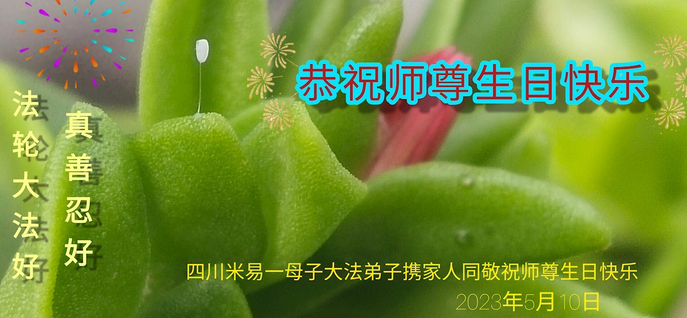 慈悲伟大的师父好,我九岁时就跟随着妈妈学大法。在邪恶疯狂时期,我和妈妈一起配合发资料,写标语、贴标语、挂条幅。在妈妈多次被抓、被关押期间,我没有动摇信念。至今我坚信师父、坚信大法,我非常珍惜师父赐予的“正法时期大法弟子”的神圣称号。我生逢在师父传宇宙大法时期,万分感谢师父的伟大赐予,这是我生生世世的期盼,这是我来到人世的夙愿。在普天同庆的日子里,我怀着虔诚的心感恩师父,这是无法用人类语言来表达的心境。天地同庆,万物感恩,颂歌献给师父:谢谢师父的慈悲关怀,祝师父生日快乐!祝大法洪传三十一周年!