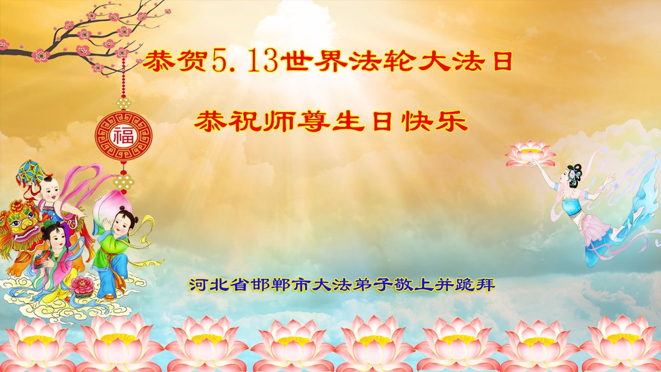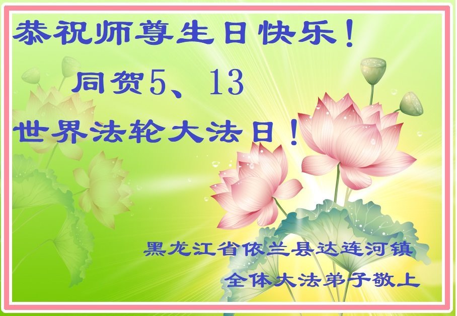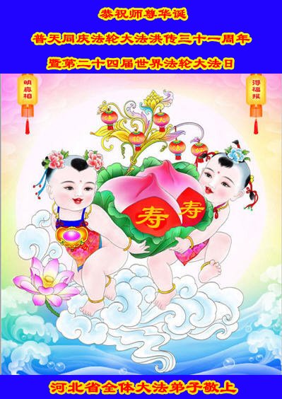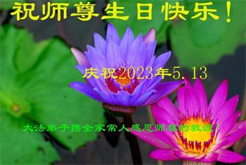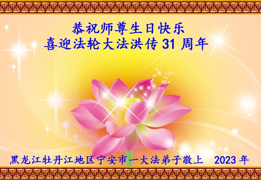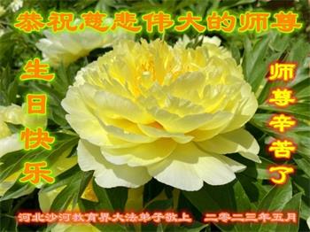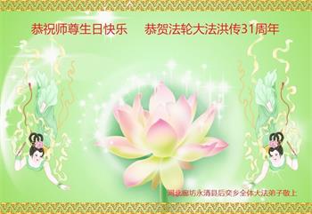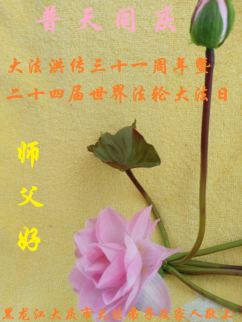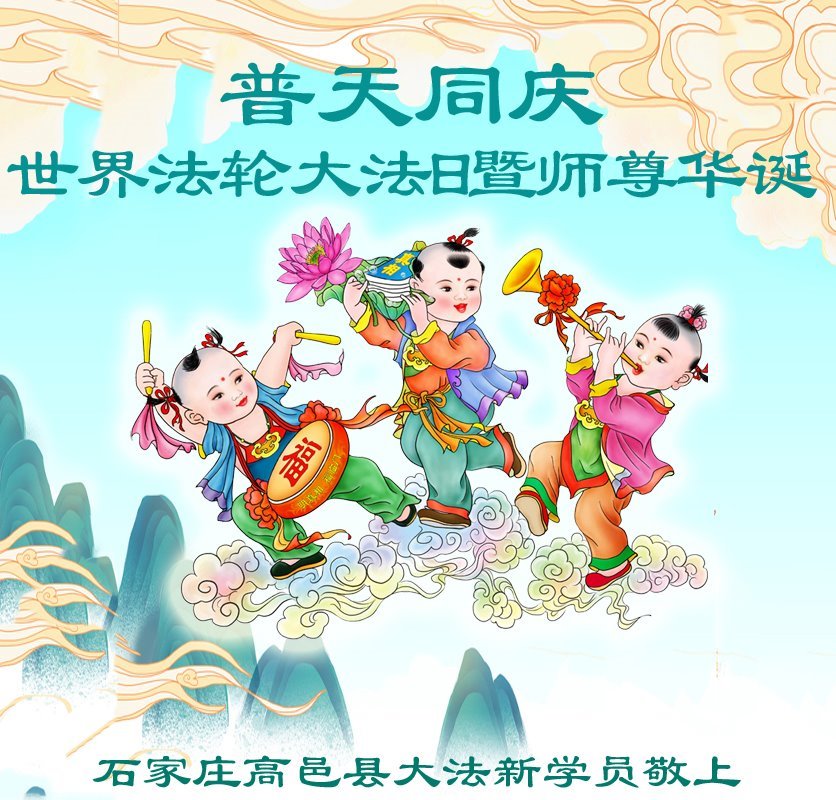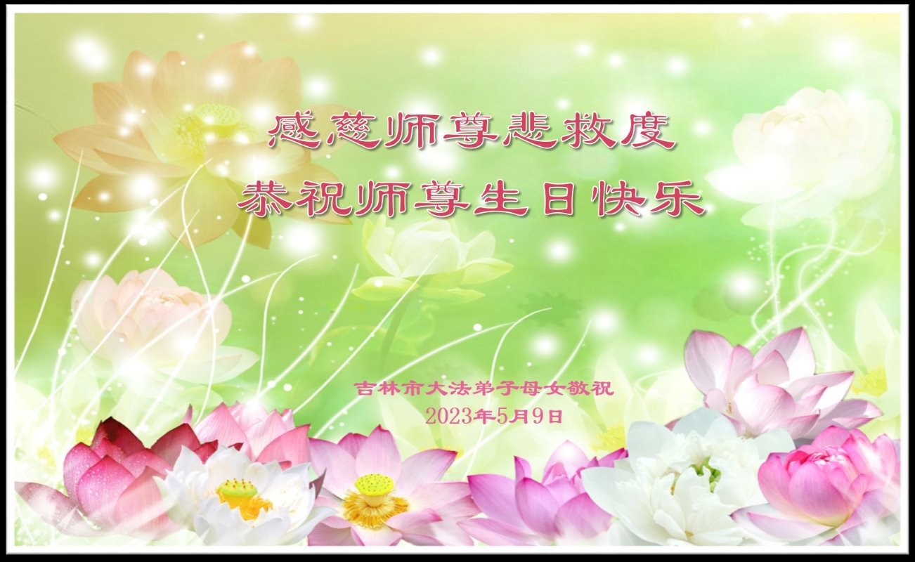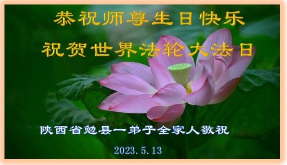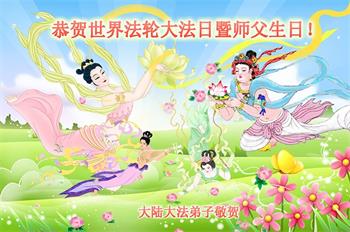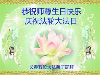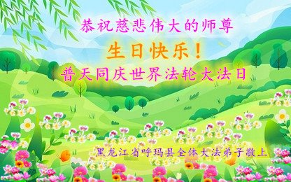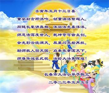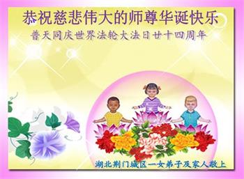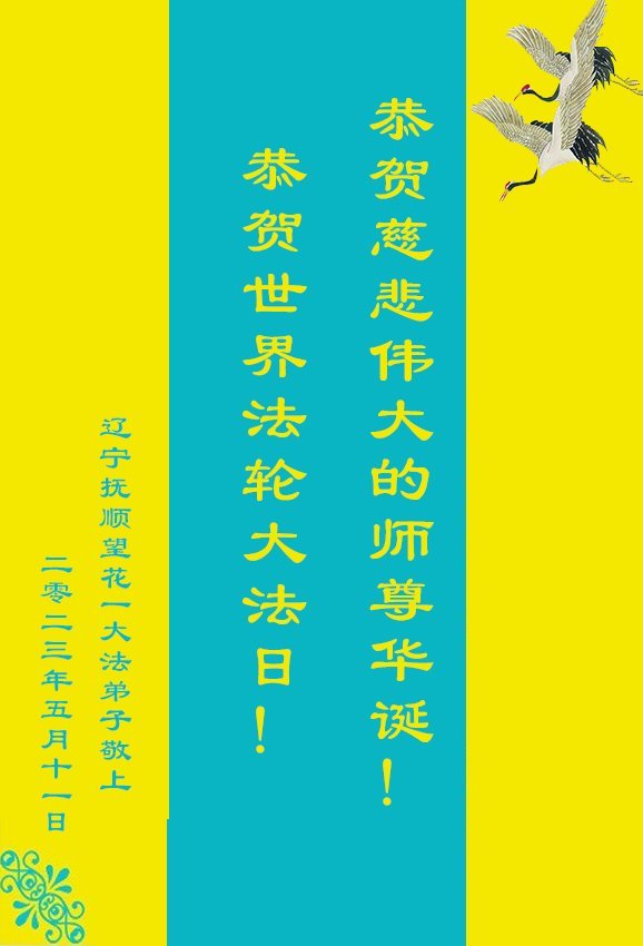 慈悲伟大的师父好,我九岁时就跟随着妈妈学大法。在邪恶疯狂时期,我和妈妈一起配合发资料,写标语、贴标语、挂条幅。在妈妈多次被抓、被关押期间,我没有动摇信念。至今我坚信师父、坚信大法,我非常珍惜师父赐予的“正法时期大法弟子”的神圣称号。我生逢在师父传宇宙大法时期,万分感谢师父的伟大赐予,这是我生生世世的期盼,这是我来到人世的夙愿。在普天同庆的日子里,我怀着虔诚的心感恩师父,这是无法用人类语言来表达的心境。天地同庆,万物感恩,颂歌献给师父:谢谢师父的慈悲关怀,祝师父生日快乐!祝大法洪传三十一周年!