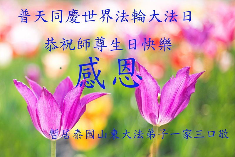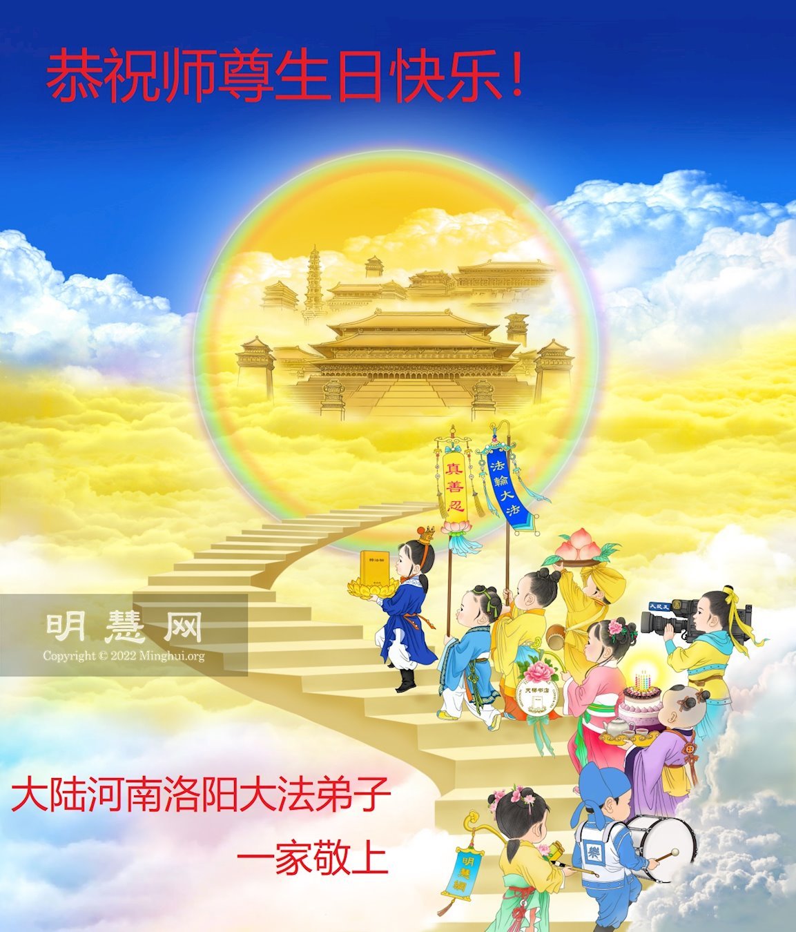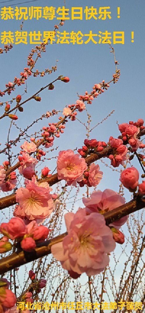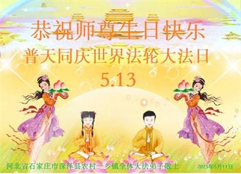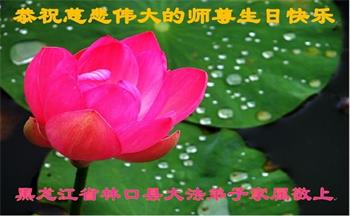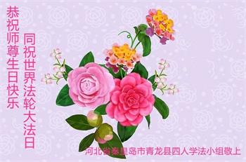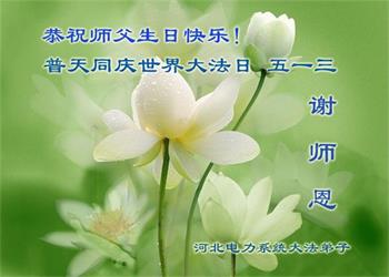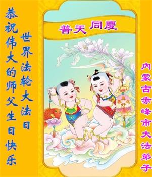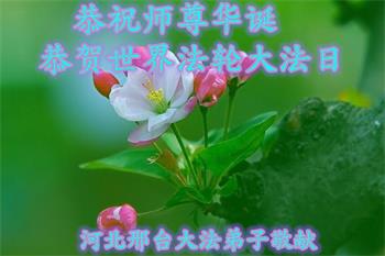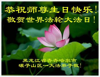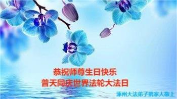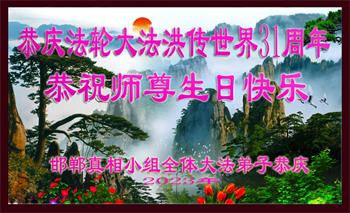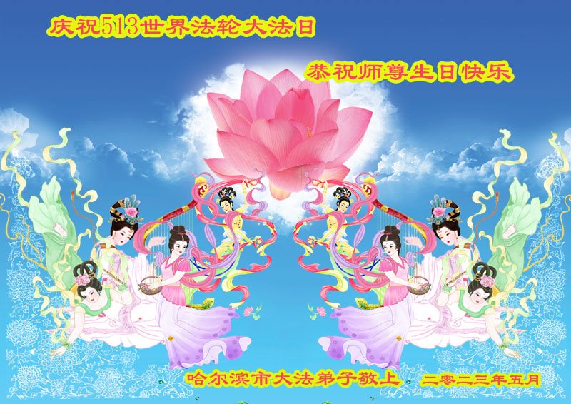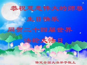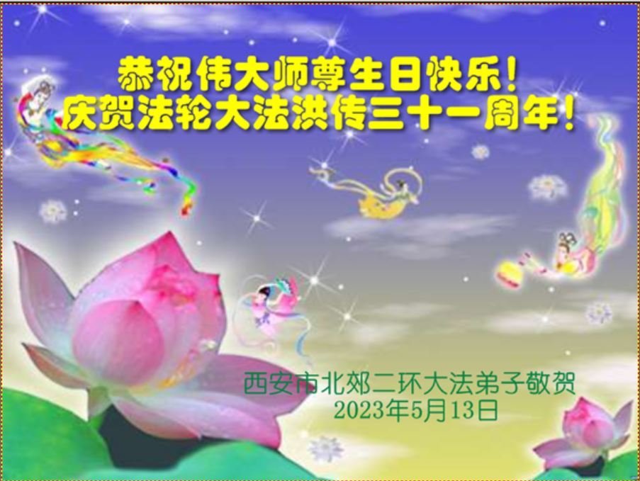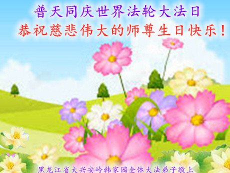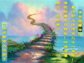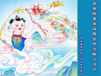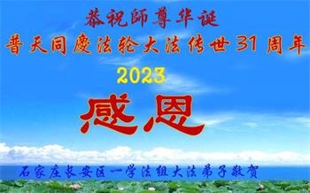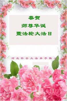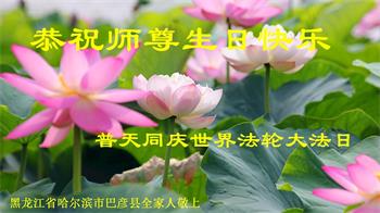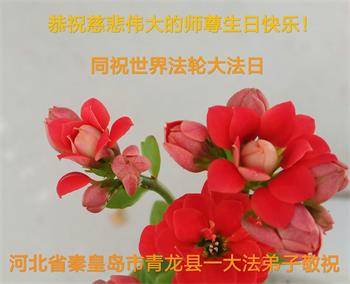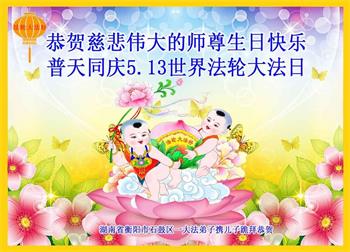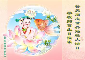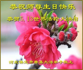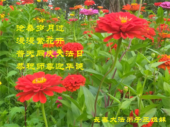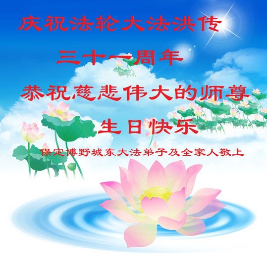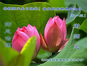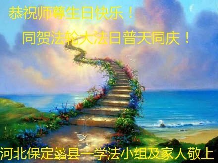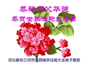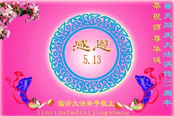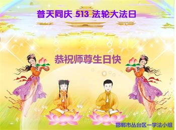 慈悲伟大的师父好,我九岁时就跟随着妈妈学大法。在邪恶疯狂时期,我和妈妈一起配合发资料,写标语、贴标语、挂条幅。在妈妈多次被抓、被关押期间,我没有动摇信念。至今我坚信师父、坚信大法,我非常珍惜师父赐予的“正法时期大法弟子”的神圣称号。我生逢在师父传宇宙大法时期,万分感谢师父的伟大赐予,这是我生生世世的期盼,这是我来到人世的夙愿。在普天同庆的日子里,我怀着虔诚的心感恩师父,这是无法用人类语言来表达的心境。天地同庆,万物感恩,颂歌献给师父:谢谢师父的慈悲关怀,祝师父生日快乐!祝大法洪传三十一周年!