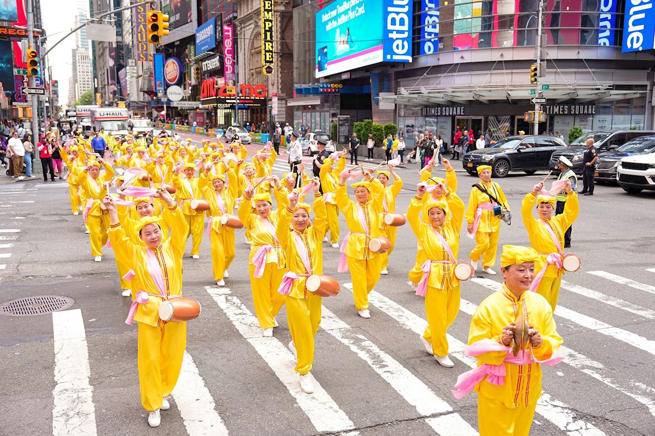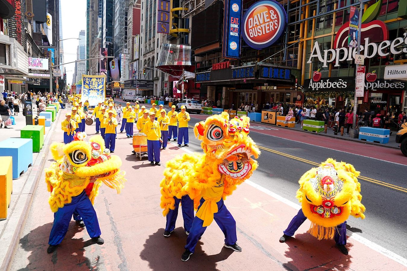 从东城的一大道到西城的十二大道,五千名法轮功学员行进在曼哈顿繁华繁忙的四十二街上,一眼望不到头。纽约居民、上班族以及世界各地的游客,观赏到了游行活动的盛况,纷纷拍照摄像,共享鼓乐齐鸣、普天同庆的喜悦。