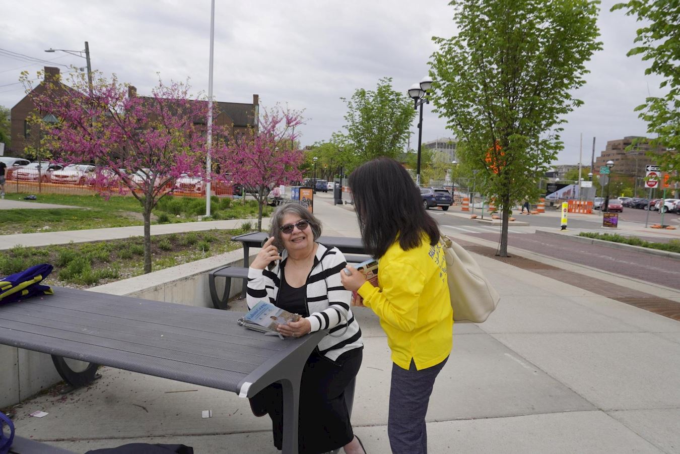 【明慧网二零二三年五月十五日】二零二三年五月十三日,为了庆祝世界法轮大法日,部分密西根法轮功学员来到安娜堡市中心的农贸花卉市场,发放法轮功真相资料并举行集体炼功。