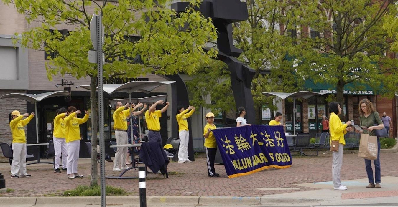图5~6:五月十三日早上,部份密西根法轮功学员来到安娜堡市中心集体炼功