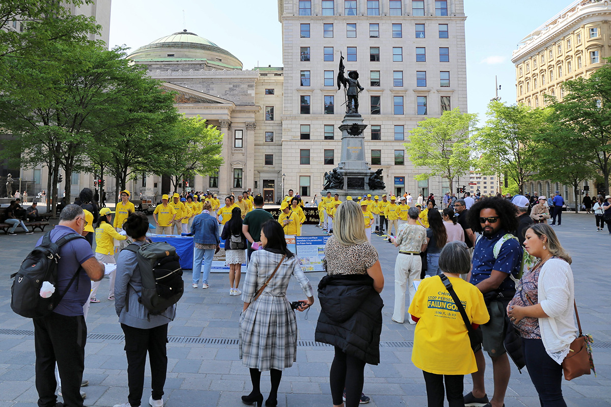 【明慧网二零二三年五月十六日】二零二三年五月十三日世界法轮大法日,加拿大蒙特利尔部分法轮功学员在老城的兵器广场,以集体炼功、传递真相的方式,庆祝法轮大法洪传世界三十一周年,并与民众分享法轮大法的美好。