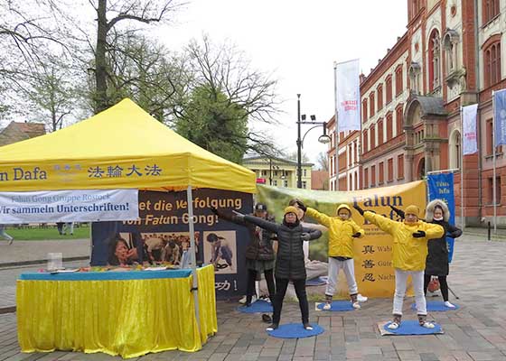 五月七日,为了庆祝世界法轮大法日,法轮功学员在德国北部的汉莎城罗斯托克举办信息日活动,传播法轮功的真相。