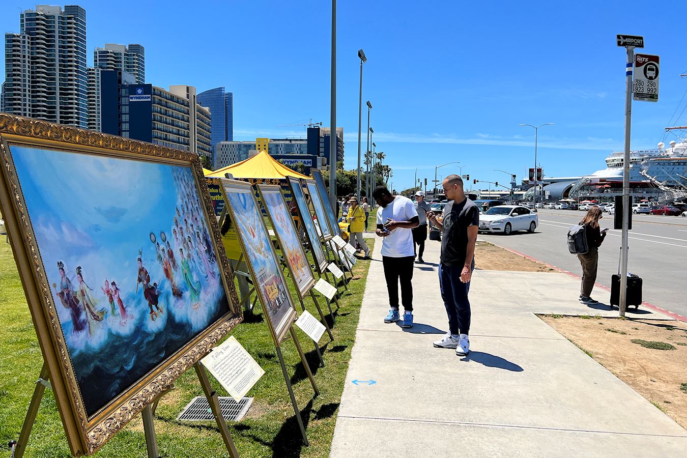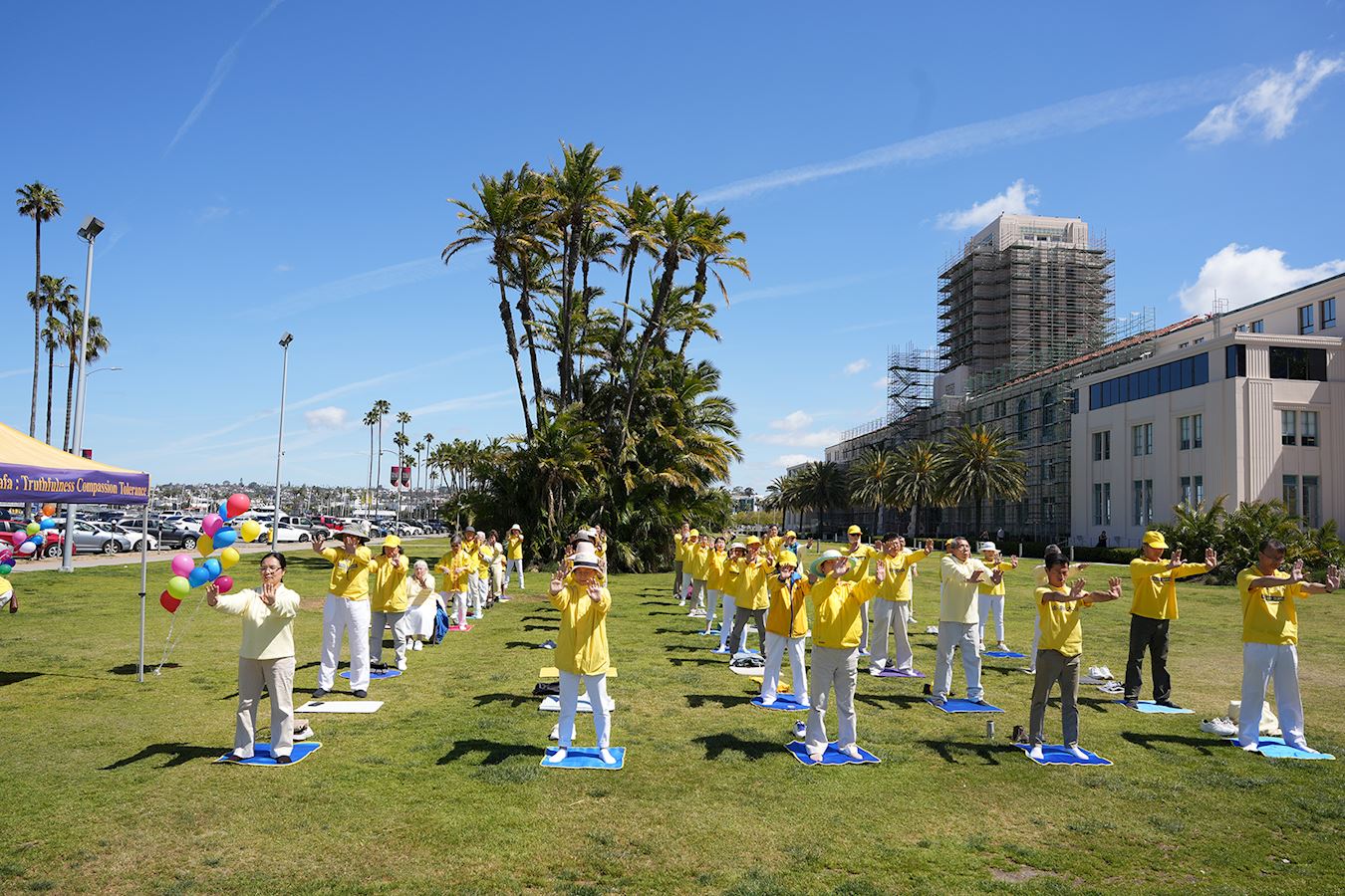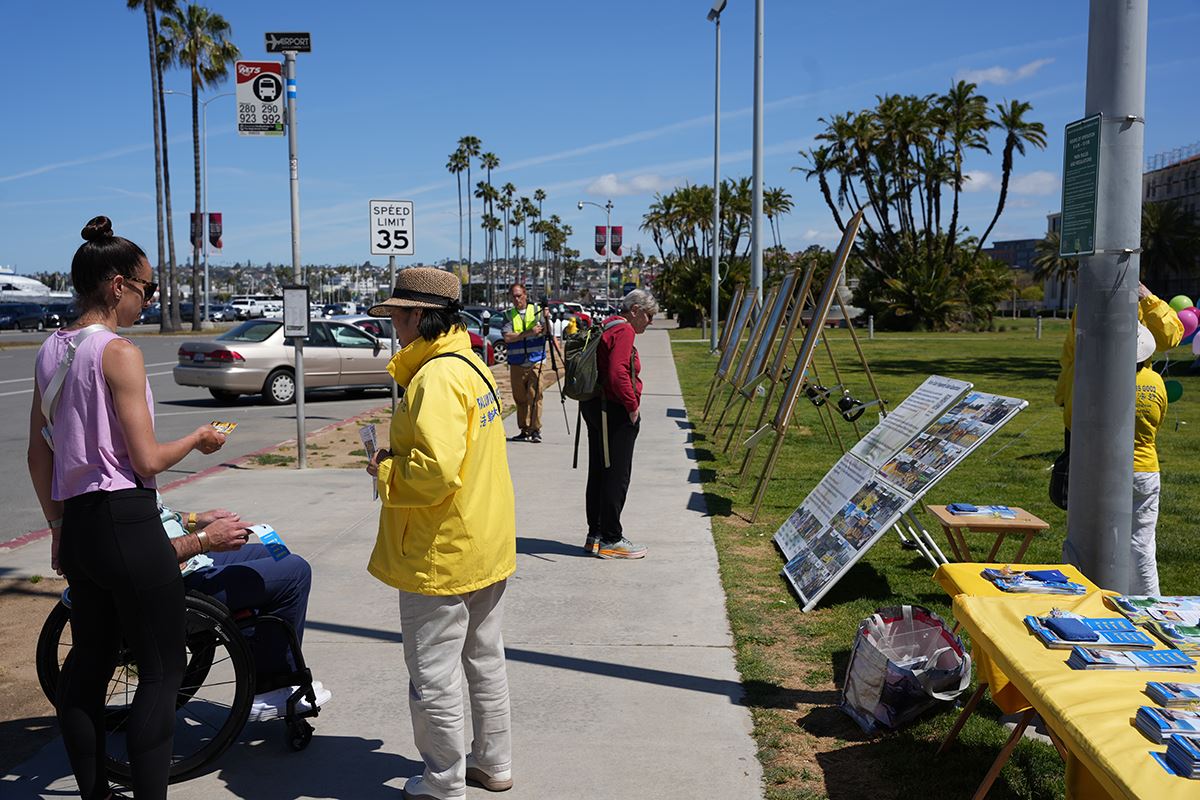 图1:二零二三年五月七日,法轮功学员在圣地亚哥县政府大楼前的海滨公园庆祝五一三世界法轮大法日,并恭贺法轮功创始人李洪志大师华诞。