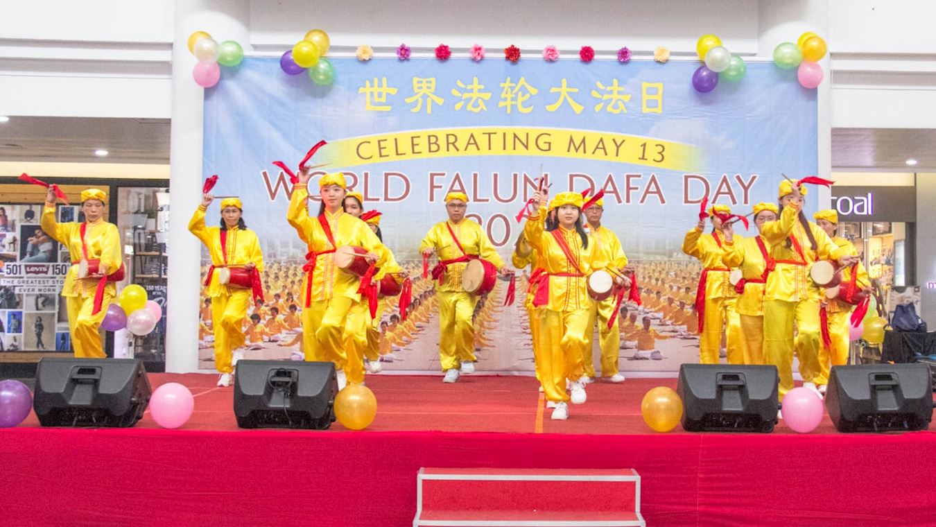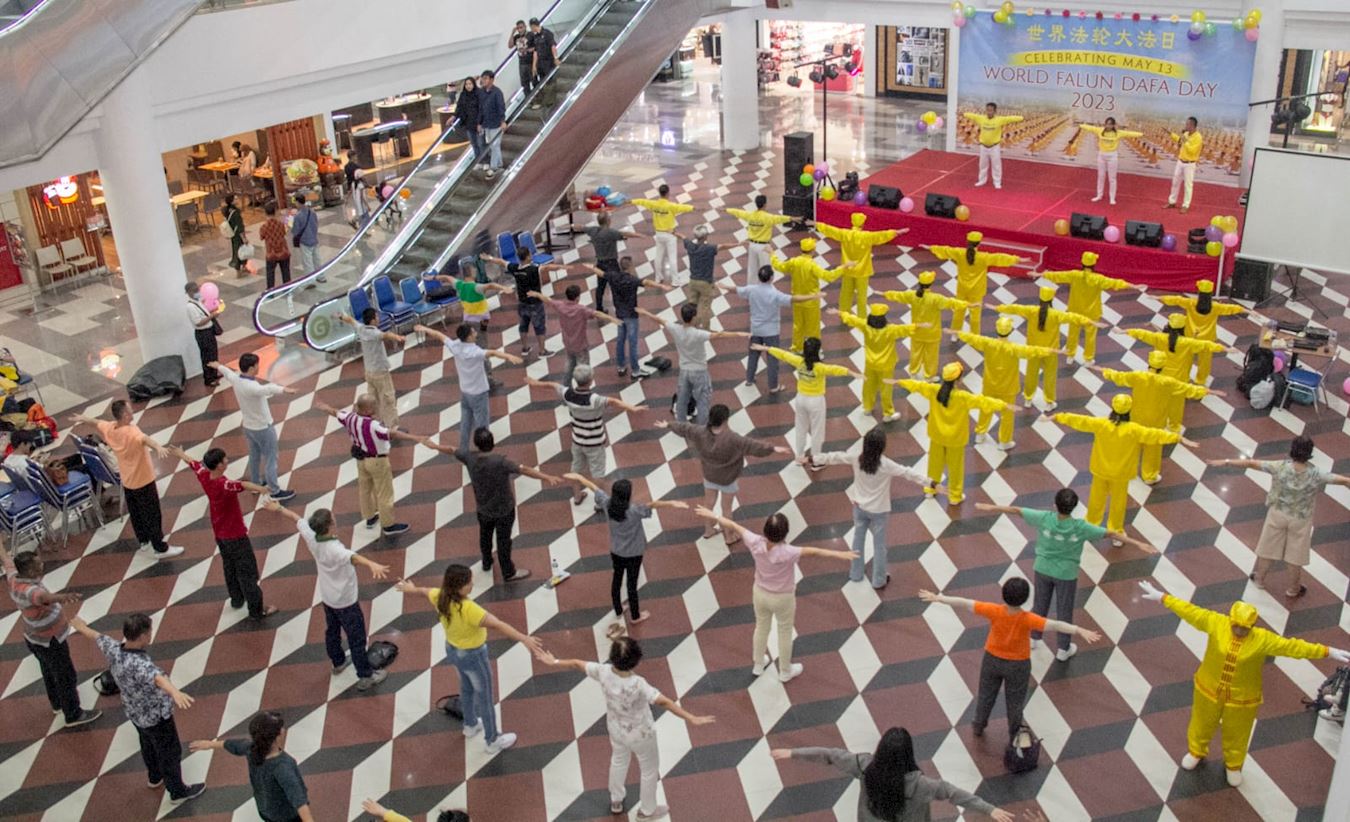 图1~5:五月十三日当天的活动,在该市最大的百货商场美佳商场(Mega Mall)举行。学员们向民众介绍法轮功,并现场教功,和民众一起炼功