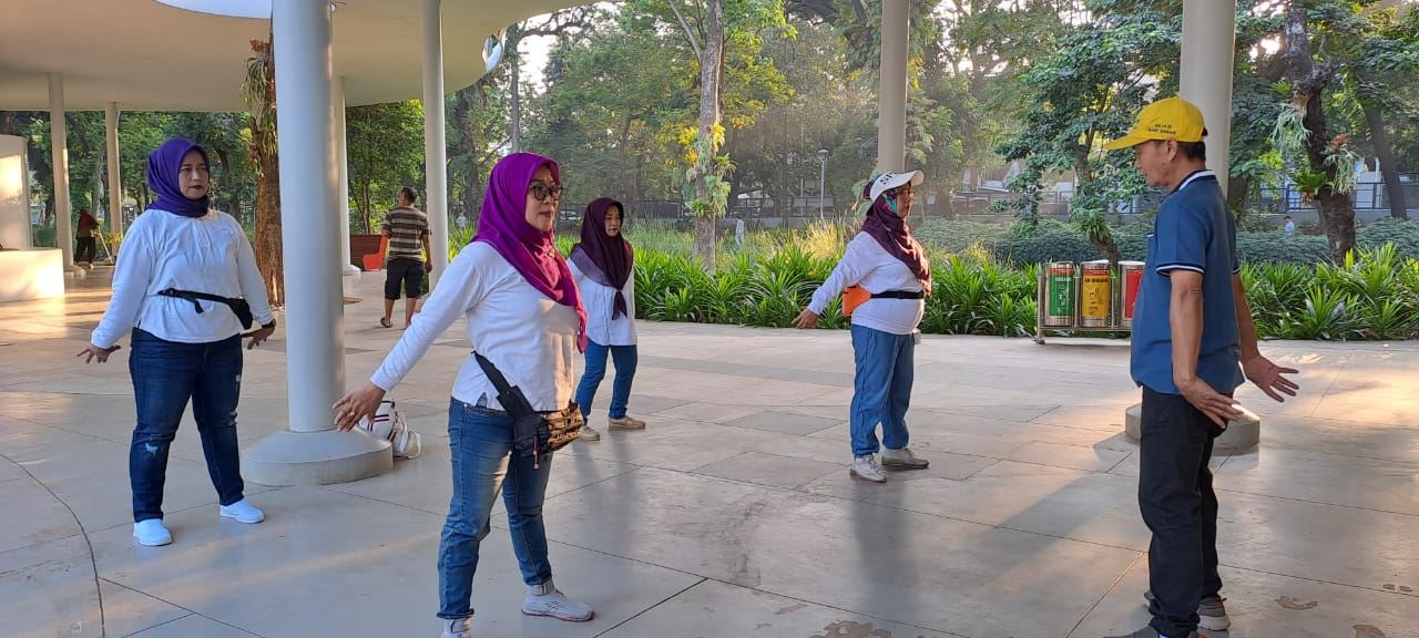 二零二三年五月十三日周六上午,学员在雅加达之德培特生态公园(Tebet Eco Park)举行集体炼功。许多到生态公园的民众停下来观看并且索取更多关于法轮大法的资讯,一起学炼法轮大法。