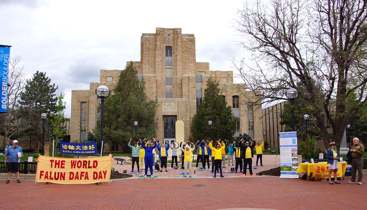 ![]() 图1~2:二零二三年五月十三日,科罗拉多州法轮功学员聚集在博尔德市法院大楼前举行活动,庆祝世界法轮大法日。 |