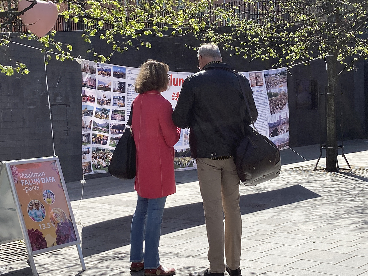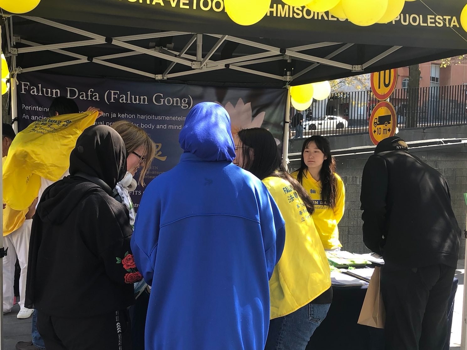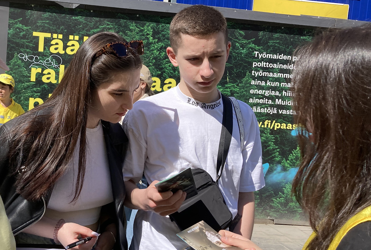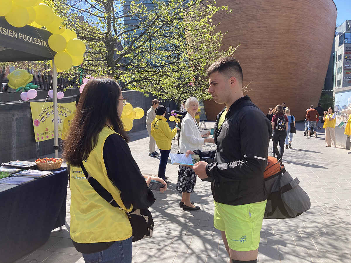迈克尔(Michael)是赫尔辛基的学生,因为他母亲曾学炼法轮大法,所以对法轮功遭遇非常了解。他的伙伴艾玛(Emma)也停下来观看庆祝法轮大法日的表演。听到中国修炼者的故事后,她对中国的问题感到非常难过,并祝愿学员们有一个美好的下午。