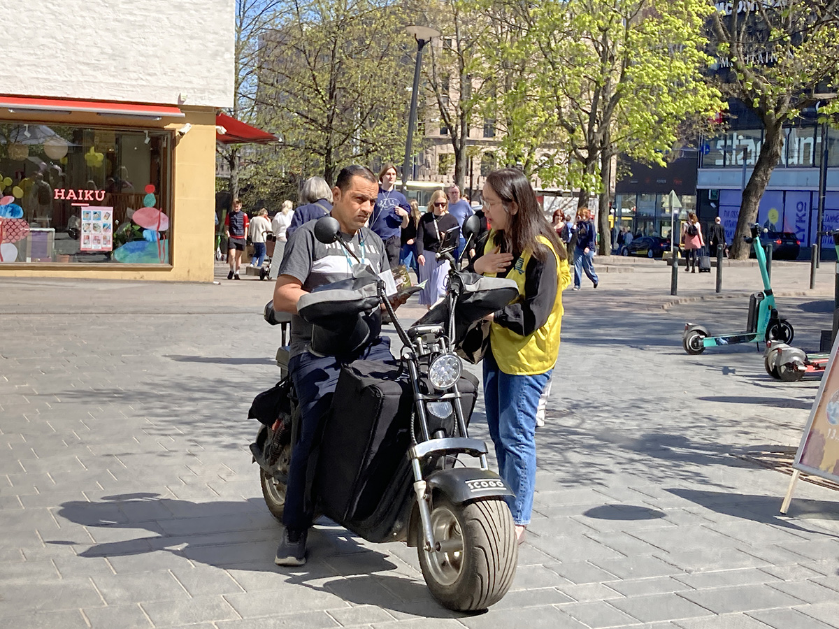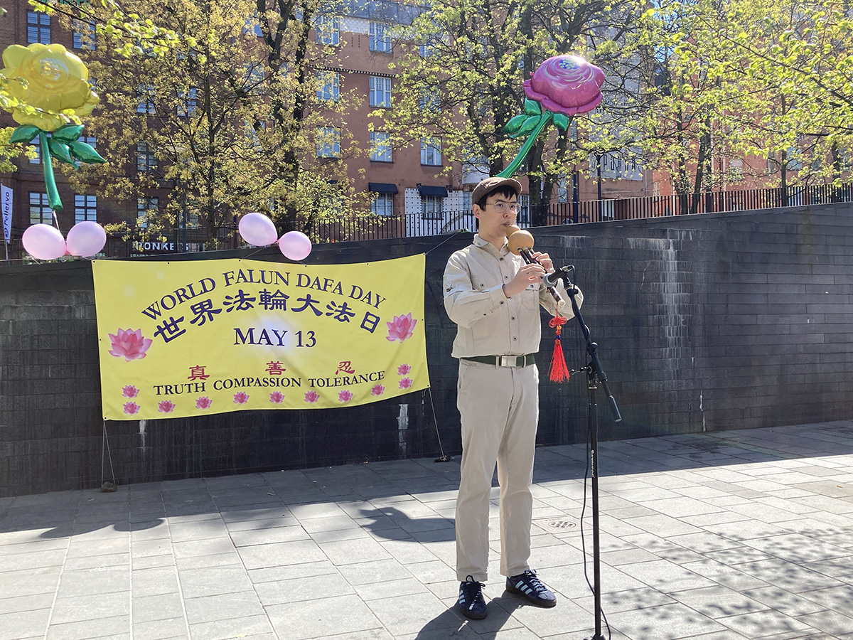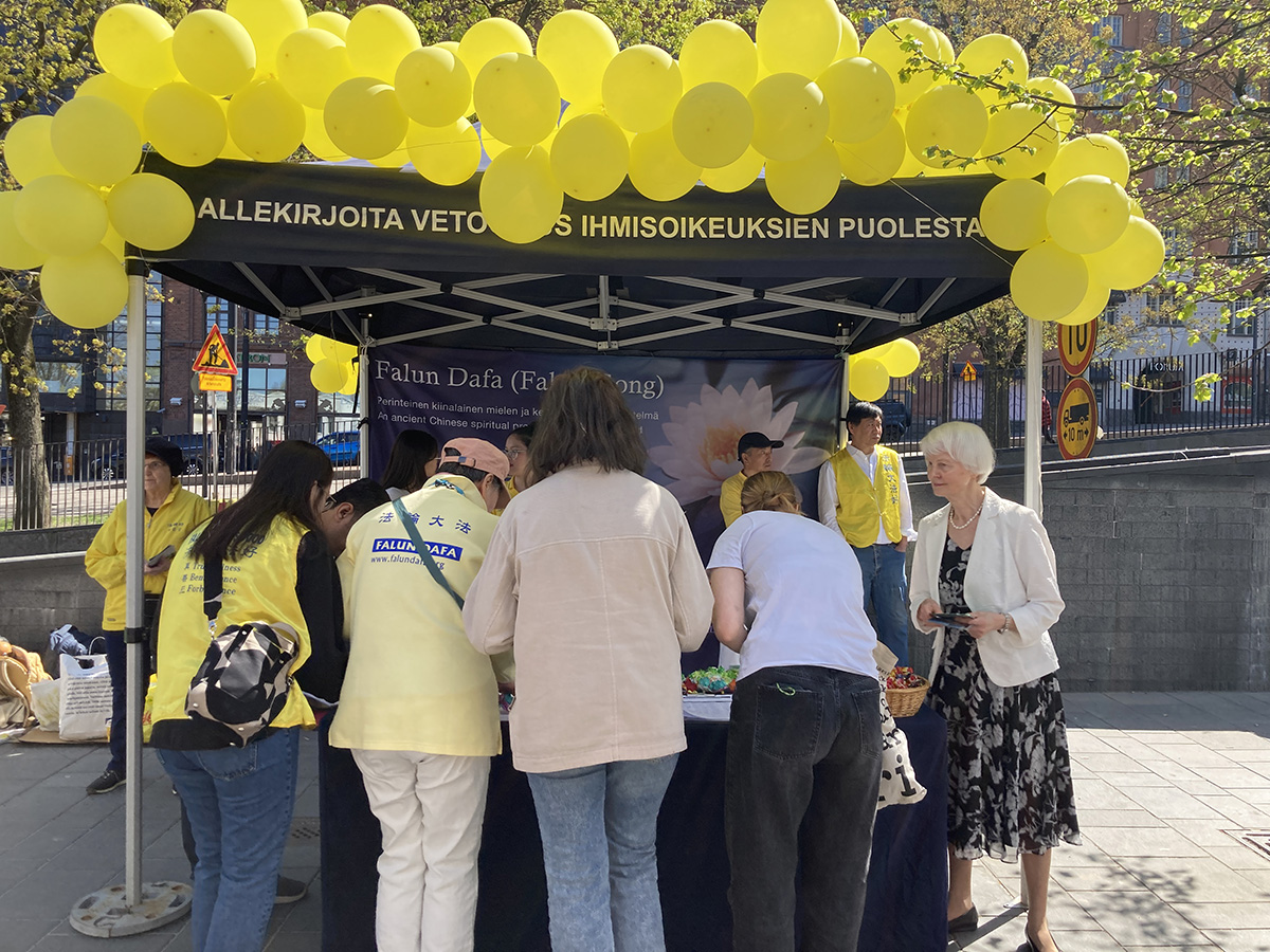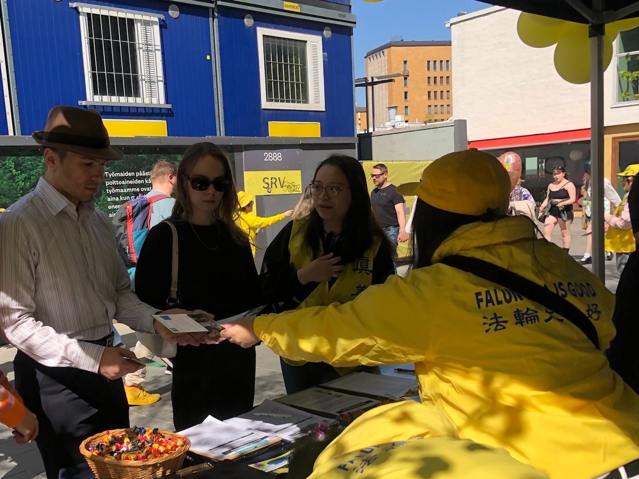 迈克尔(Michael)是赫尔辛基的学生,因为他母亲曾学炼法轮大法,所以对法轮功遭遇非常了解。他的伙伴艾玛(Emma)也停下来观看庆祝法轮大法日的表演。听到中国修炼者的故事后,她对中国的问题感到非常难过,并祝愿学员们有一个美好的下午。