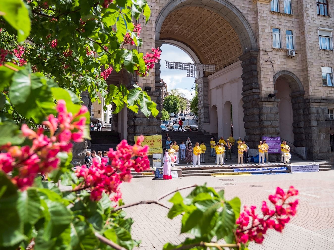五月的基辅阳光明媚,绚丽的板栗花开满街道,市政厅对面就是法轮功学员的庆祝地点,这里成了当天最美的一道风景线。