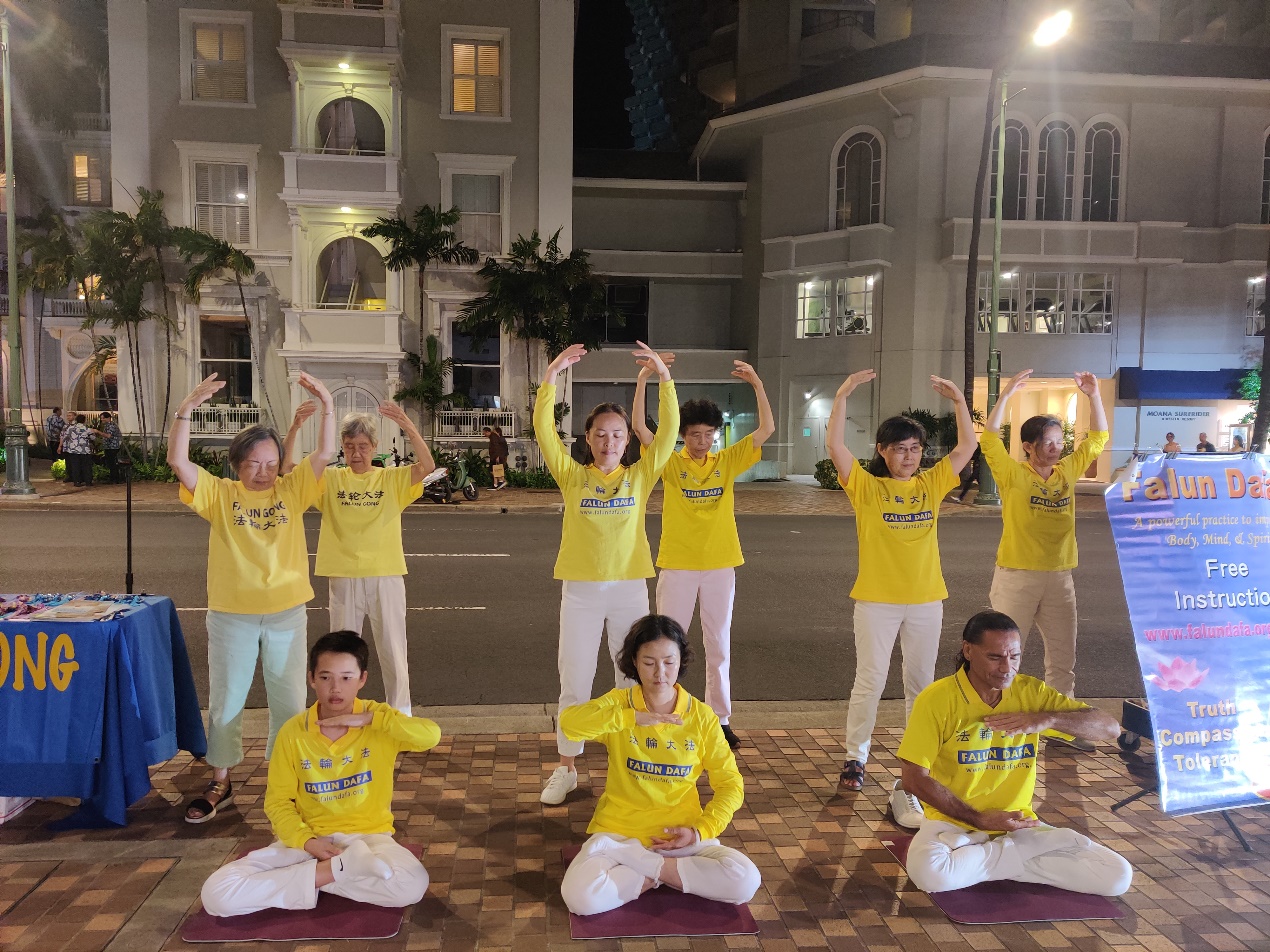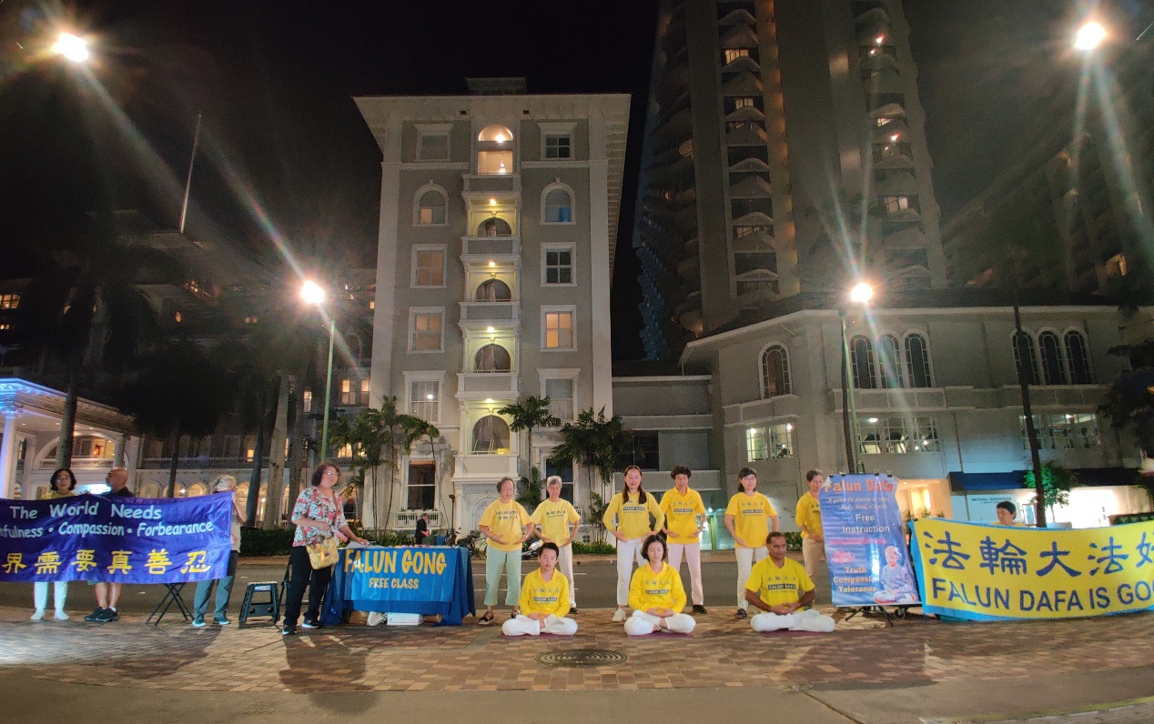 卡拉卡瓦大道被认为是夏威夷的购物天堂,吸引着来自世界各地的购物者。每天晚上都有民间艺人以各种形式展示才艺,是游客们到夏威夷度假的必访之地。在喧嚣的车流、行色匆匆的旅步中,法轮功学员平静、祥和的演示着五套功法。那种关注生命内在的宁静在不知不觉间印刻进游客一走一过的记忆中,吸引着民众驻足观看,录影录像。