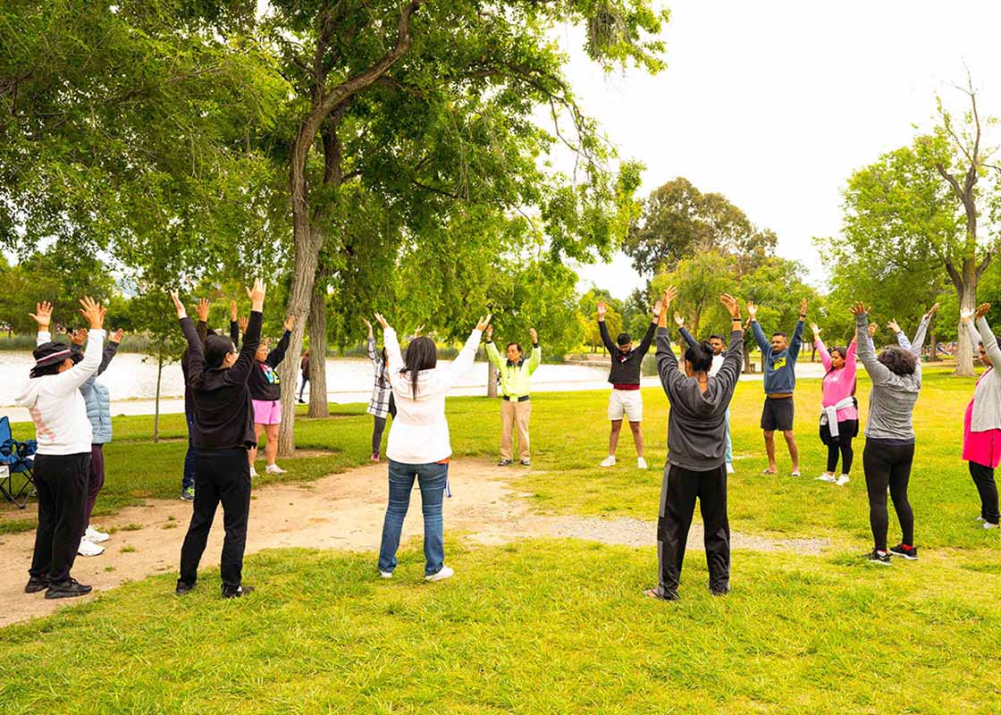 五月二十日,法轮功学员在旧金山东湾佛利蒙中央公园举办法轮功教功班。当天不少散步的民众就加入学功,体验一下法轮功功法。