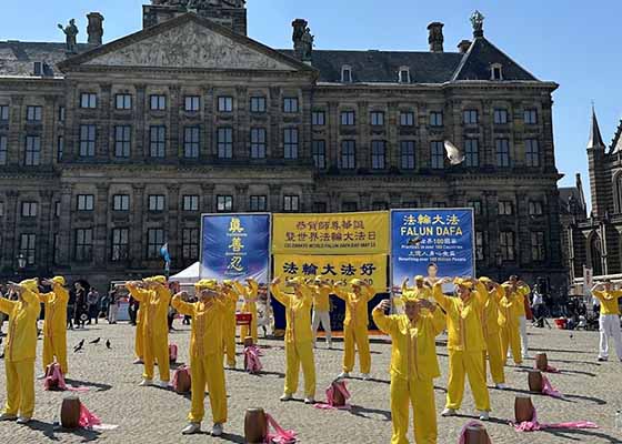 五月十三日,荷兰各地法轮功学员来到首都阿姆斯特丹市中心水坝广场举行集会,庆祝第24届世界法轮大法日,恭贺李洪志师父华诞。