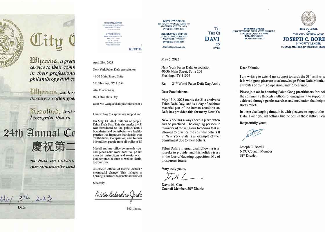 二零二三年五月十三日是第二十四届世界法轮大法日,纽约市四位市议员发贺信,祝贺世界法轮大法日,赞扬法轮功学员传播真、善、忍品德对社区繁荣的贡献。