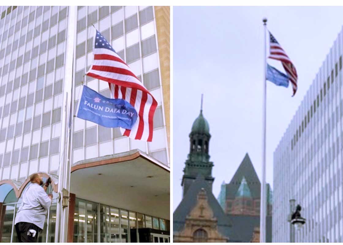 庆祝法轮大法日 美国米尔沃基市升大法旗